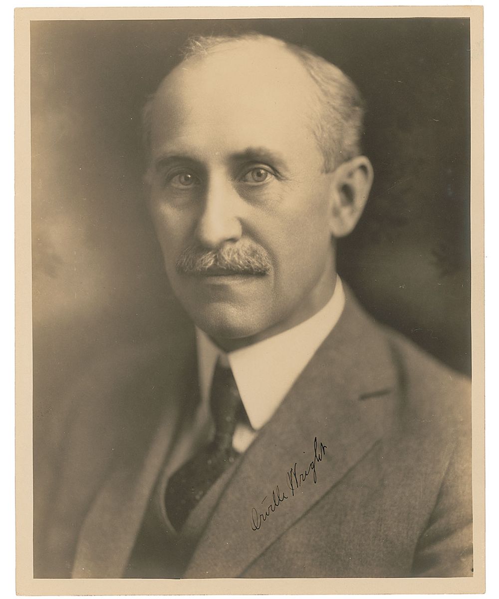 Terrific vintage matte-finish 8 x 10 bust portrait of Wright in a suit and tie, neatly signed in fountain pen. Notation to reverse reads, “Received from Dr. George W. Lewis shortly before his death, 1948.” Lewis served as the director of aeronautical research at the National Advisory Committee for Aeronautics. In fine condition. An uncommonly large photo in remarkable condition.