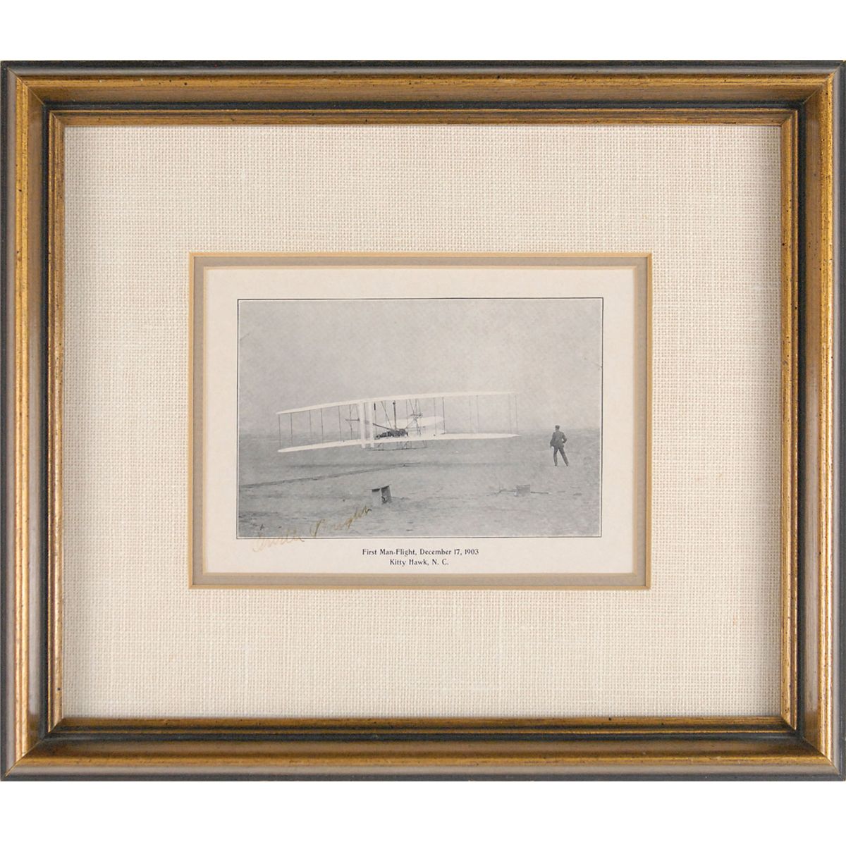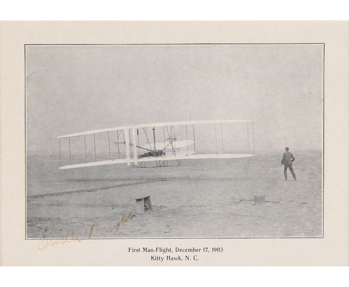 Desirable 6 x 4 cardstock photo of the Wright Brothers’ first flight at Kitty Hawk, signed in the lower left in fountain pen. Double-matted and framed to an overall size of 11.5 x 10. Portions of Wright’s signature very light but legible, otherwise fine condition.