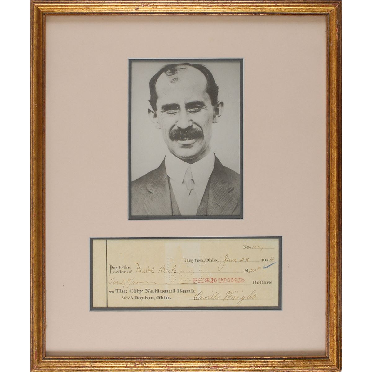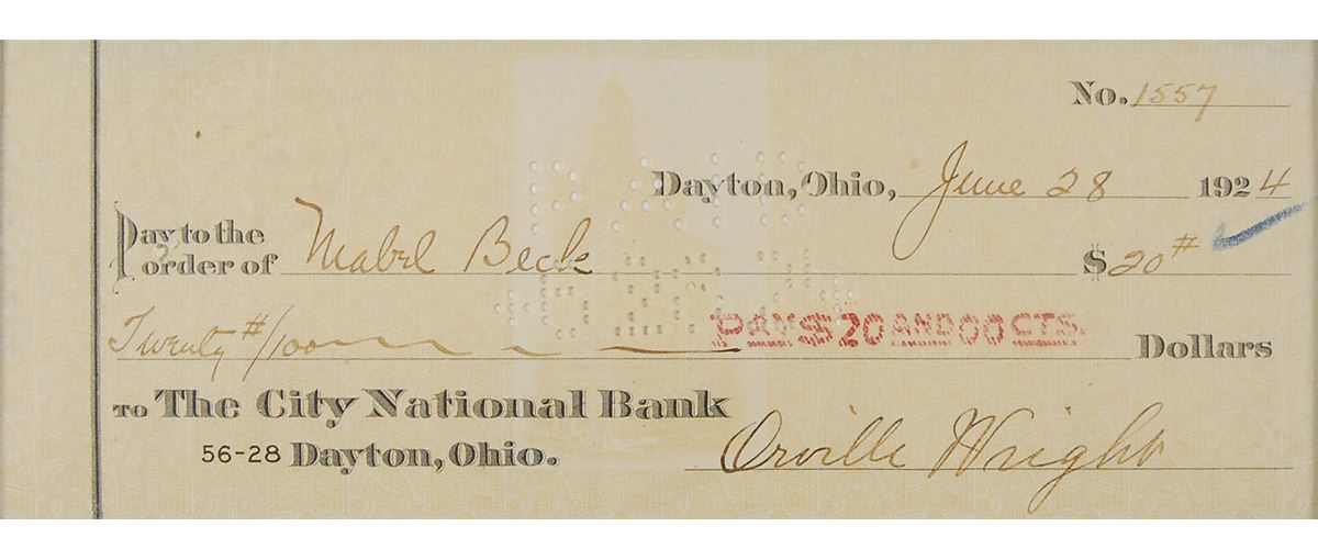 Bank check, 8.25 x 3, filled out and signed by Wright, payable to Mabel Beck for $20, June 28, 1924. Double-matted and framed with a portrait of the aviation pioneer to an overall size of 13.75 x 16.5. In fine condition, with expected cancellation holes, bank stamps, and one small checkmark. Mabel Beck was Orville Wright’s devoted friend and personal secretary for nearly 40 years.