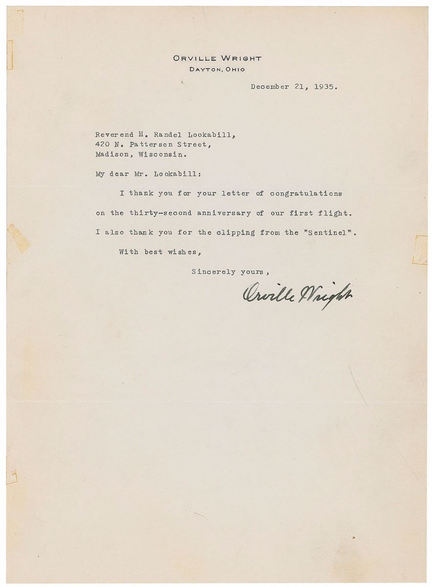 TLS, one page, 7.25 x 10, personal letterhead, December 21, 1935. Brief letter to Reverend H. Randel Lookabill, in full: “I thank you for your letter of congratulations on the thirty-second anniversary of our first flight. I also thank you for the clipping from the ‘Sentinel.’” In fine condition, with small mounting remnants to edges. Accompanied by the original mailing envelope. An appealing, boldly signed example.