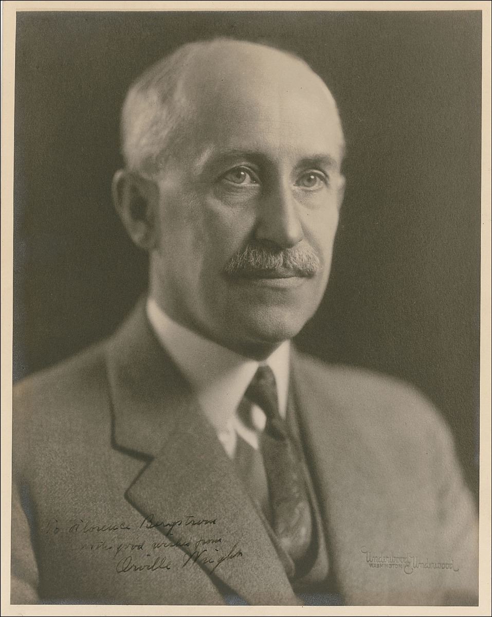 Outstanding matte-finish 8 x 10 formal Underwood & Underwood portrait of the distinguished aviator, signed and inscribed in fountain pen, “To Florence Bergstrom, with good wishes from, Orville Wright.” In fine condition, with mild toning, a hint of silvering to edges, and irregular ink flow to first few letters of inscription. A superlative and most unusual portrait.