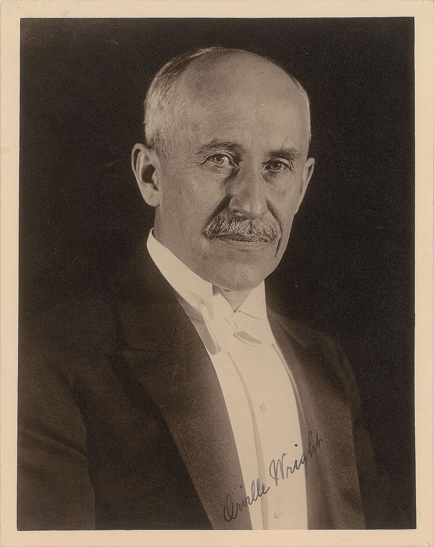 Vintage matte-finish 7.5 x 9.5 studio portrait of Orville Wright wearing a tuxedo, signed in fountain pen. In fine to very fine condition.