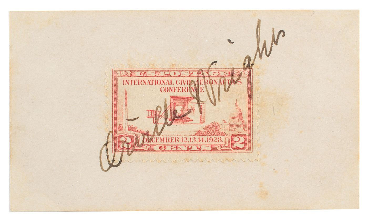 Vintage fountain pen signature, "Orville Wright,” over a two-cent postcard stamp honoring the 1928 International Civil Aeronautics Conference affixed to an off-white 3.5 x 2 card. In fine condition, with light foxing.