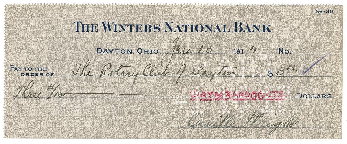 Bank check, 7.5 x 3, filled out in another hand and signed by Wright, payable to The Rotary Club of Dayton for $3.00, July 13, 1917. In fine condition, with vertical fold through one letter of signature, expected stamps, holes, and cancellations and a small staple hole to top left. Pre-certified PSA/DNA and RRAuction COA.