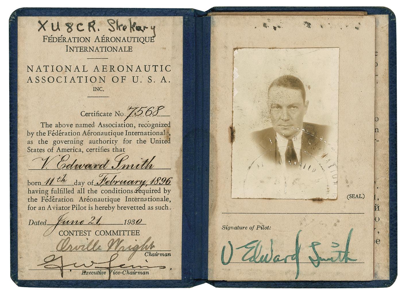 Partly printed leatherbound pilot’s license, four pages, 3 x 4.25, June 21, 1930. Certificate no. 7568, for V. Edward Smith, signed “Orville Wright” as Chairman of the Federation Aeronautique Internationale Contest Committee. Wright signs at the bottom of the first page, with the photo and signature of Smith alongside on page two. Inside back cover contains a request, printed in various languages, for assistance to the holder of the certificate. In very good condition, with uniform mild toning to first page, scattered light toning, handling wear, and soiling, light rubbing and handling wear to covers, and binding a bit loose and fragile.