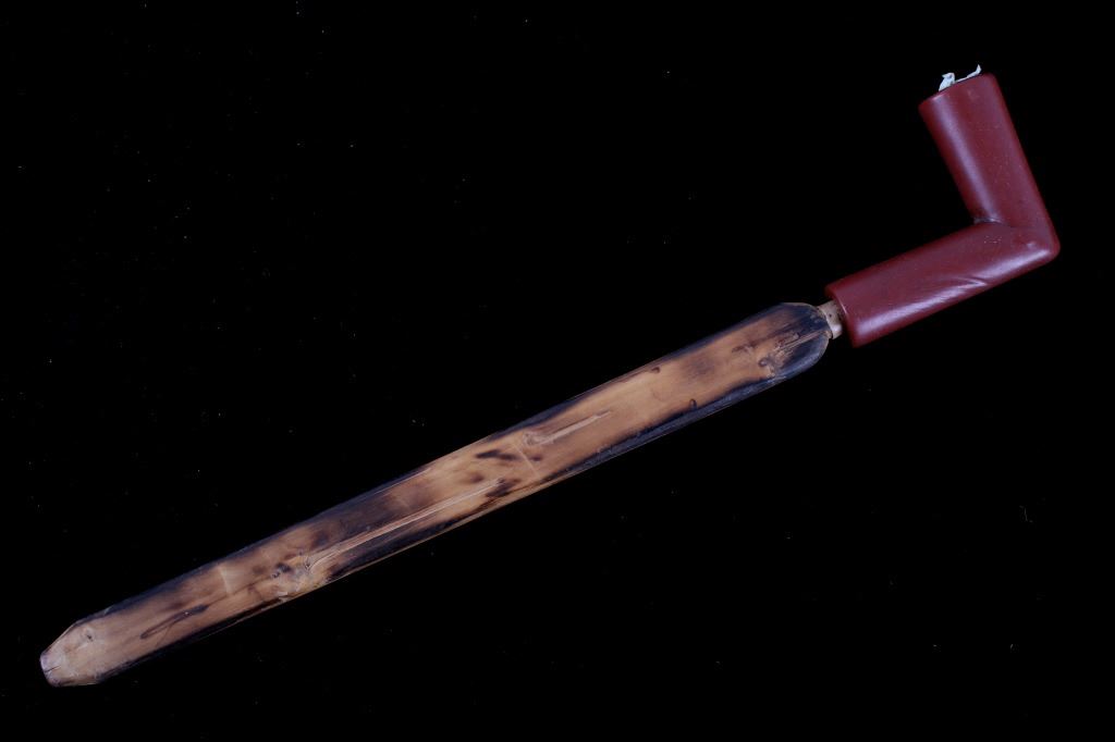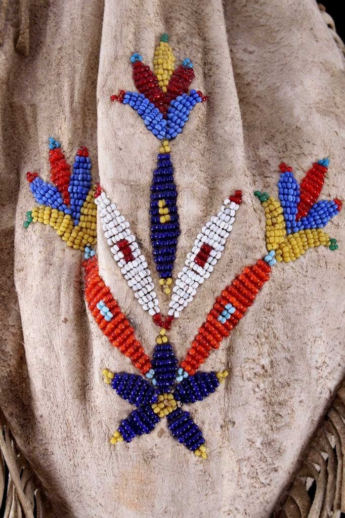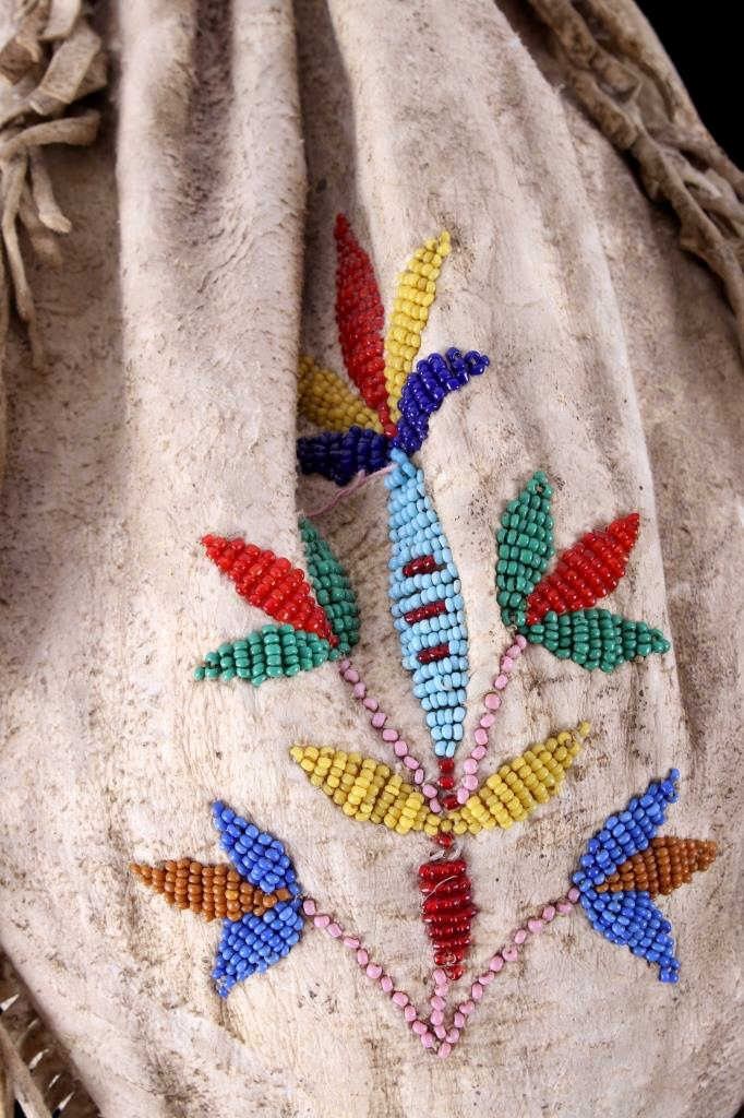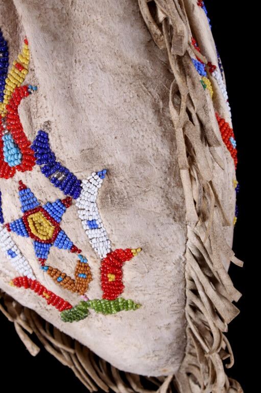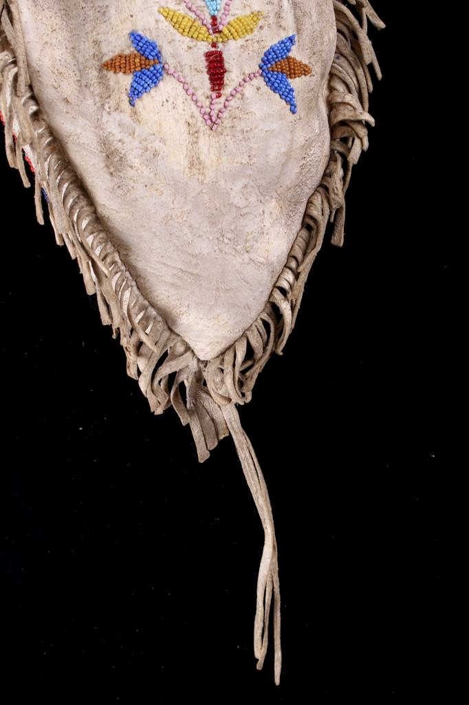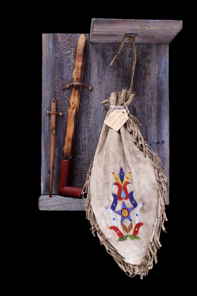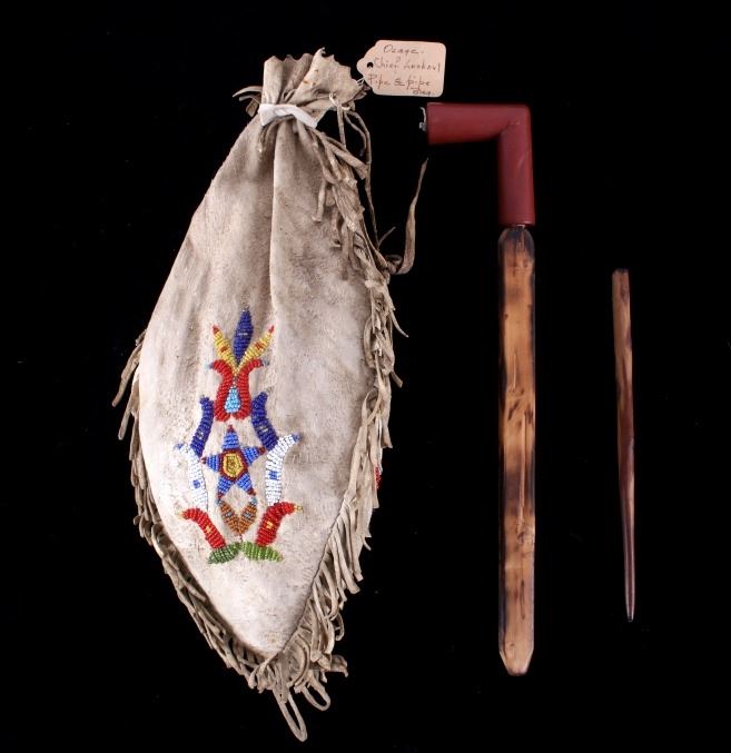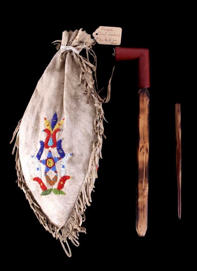 This is an authentic 19th Century beaded pipe bag with pipe from Osage American Indian Chief Fred Lookout. The piece was purchased from Bonham’s Auction House 40 years ago by the current collectors family where it has been displayed since. The lot includes an outstanding whimsically beaded pipe tobacco bag dating to the 19th Century and a later early 1900 elbow catlinite pipe with wood stem and wood tamper. The set was owned and used by Osage Chief Fred Lookout (1865-1949). Chief Lookout was one of the leaders of the Osage people and was born near Independence, Kansas. Lookout entered tribal politics in 1908 when he was elected as assistant principal chief and then later appointed the principal chief by the U.S. Secretary of the Interior Walter L. Fisher, replacing Bacon Rind. He served as the principal Chief of the Osage Nation for most of the rest of his life until his death in 1949. The bag shows an Indian tanned hide construction having a fantastic pattern of three panels sewn together with an artful hand cut long fringe accent down each of the three seems. Each of the three sides shows excellent whimsical geometric beadwork with all early circa 1800’s period correct glass trade seed beads of greasy yellow, butterscotch, chalk white, cobalt, semi-transparent red, semi-transparent green, sky padre blue, medium green and Cheyenne pink in designs such as a five-pointed star, flower, blossoms and possibly corn. The top of the bag shows the original tie straps and an old collection museum tag which states, “Osage Chief Lookout Pipe & Pipe Bag”. The pipe shows a pipestone catlinite elbow design which has been nicely hand carved and has a good rich smoked patina. Along with the pipe is a possibly later added short wood pipe stem which shows an old original gasket at the pipe connection and burnt finish, a truly artistic and ceremonial addition. Along with the pipe is an original wood pipe tamper. Provenance: From the private family collection of Sarah Alling of Helena, Montana. The piece was purchased by her family at Bonham’s Auction House over 40 years ago. The family collection of Sarah Alling, a 5th Generation Montanan, began in the 19th Century and has grown since. Along with being an avid collector herself, Sarah co-founded with Bruce VanLandingham Sundog Fine Art of Bozeman, Montana which was both part museum and gallery. The bag measures 15”L with an additional 6”L of fringe by 7”W x 7”D. Comes on a display which was created by Sarah Alling’s father, the original purchaser.