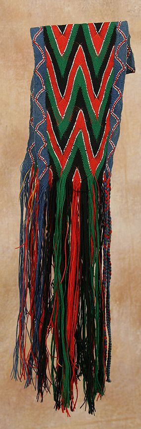 Osage Sash. 34" x 7" finger-woven in blue, red & green with white bead accents. 17" fringe with a braid on each end. Circa 1900. (est. $1,800-2,200). CONDITION REPORTS: www.auctioninsantafe.com/docs/cr2012.pdf