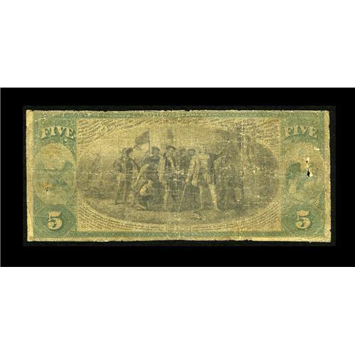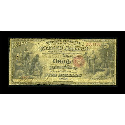 <B>Osage, IA</B></I> - $5 Original Fr. 397 <B>The Osage NB</B></I> Ch. # 1618<BR>While several notes are listed in the census from this Osage bank, most all have been closely held for many years, with the Gengerke data showing the last offering of any kind from here save for this piece at public sale coming back in 1986. This example has a fascinating story to tell, as it was one of a group of 450 sheets stolen from this Iowa bank and placed into circulation by the thieves. Most of the surviving examples bear a red or purple stamped"S" on the face, evidently placed by the treasury to signify "Stolen." This note lacks that mark. Well circulated <B>Good-Very Good,</B></I> with a few small holes and splits typical for the grade.