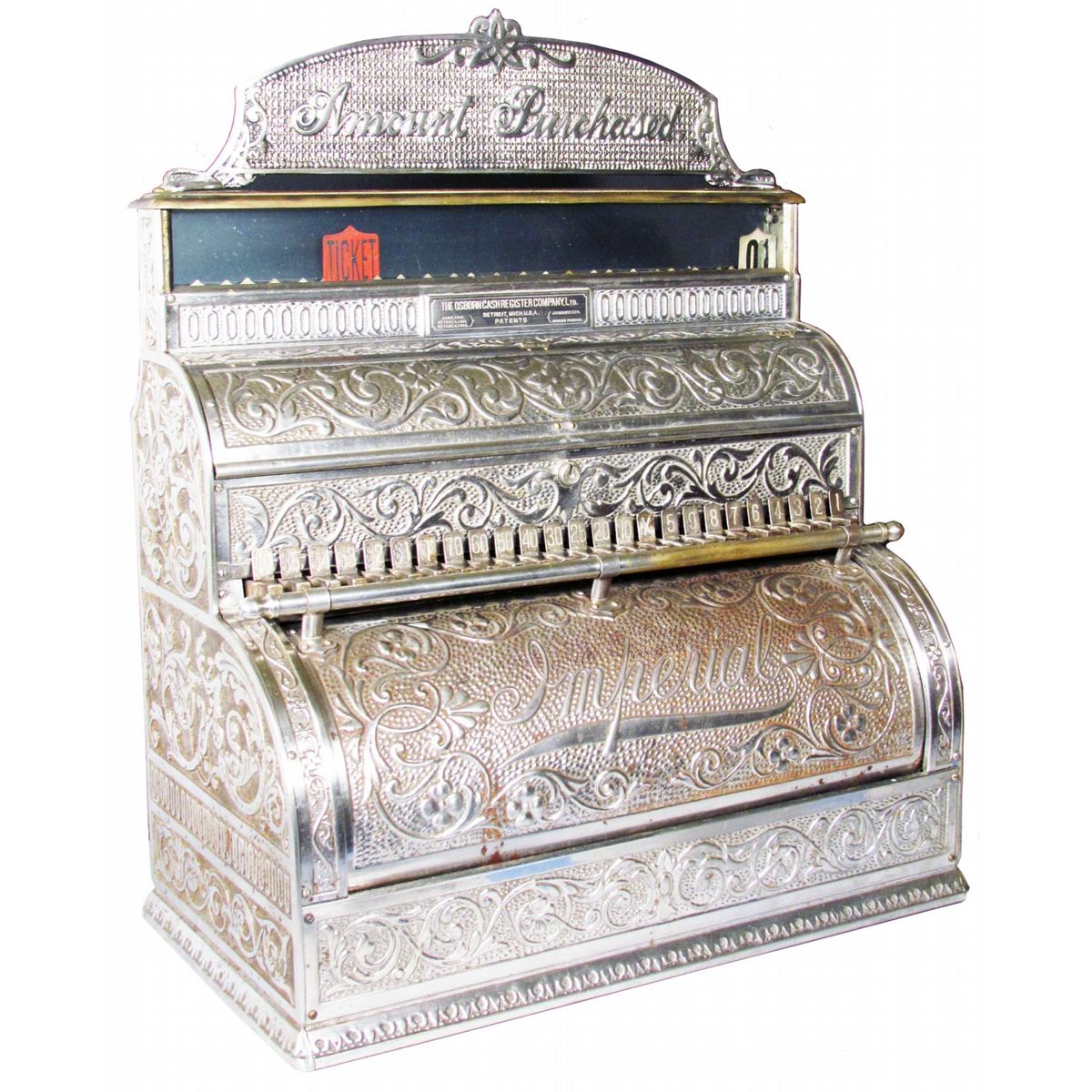 Osborn Cash Register "The Imperial". Detroit, MI. Patent 1891. The first cash register in Neihart, Montana. Heavy embossed tin. Comes with key. Reproduction top sign. 19 X 22 X 10 inches.