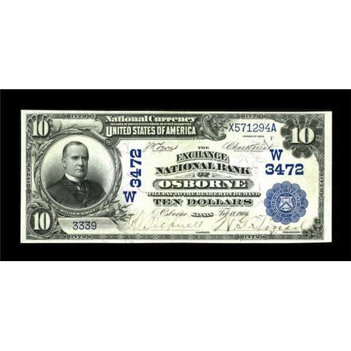 <B>Osborne, KS</B></I> - $10 1902 Date Back Fr. 617 <B>The Exchange NB</B></I> Ch. # (W)3472<BR> This attractive example is the only Date Back listed in the census from this bank. Pen signed <B>Extremely Fine-About Uncirculated, </B></I>considerably nicer than all but one of the other large notes reported from here. <BR><I>From The J.S. Weber Collection.</B></I><BR><BR><b>Shipping:</b> Coins & Currency (<a target="_blank" href="http://www.heritageauctions.com/common/shipping.php">view shipping information</a>)