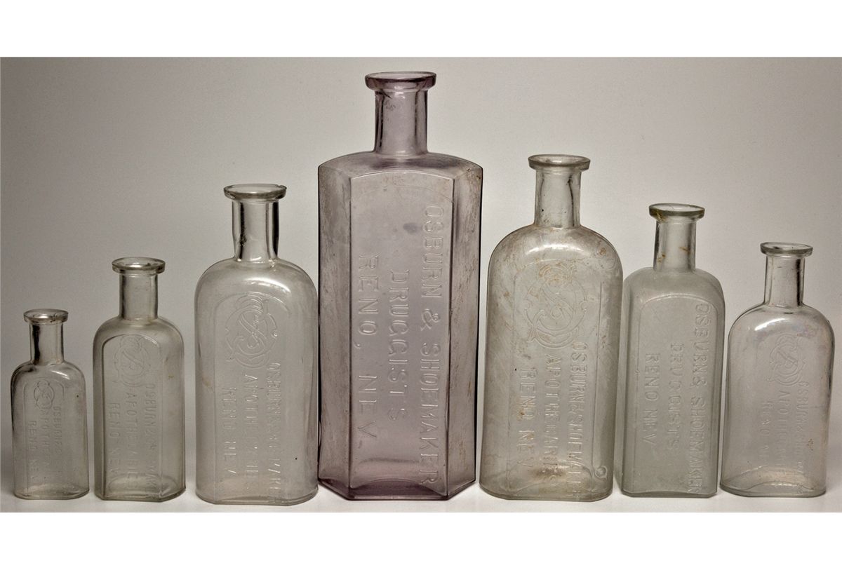 Lot of 7 bottles of various sizes and shapes, including: 1) A 8.25” “practical” or “duplex” oval bottle embossed “16/ Osburn & Shoemaker/ Druggists/ Reno, Nev.” and embossed “Pat’d May 15 1888/ D.F. & D” on the bottom. Straight neck and applied top. Clear glass, purple hue, chipping along neck, 2 medium bubbles and several small bubbles throughout body. Very little staining. 2) A 6.75” Philadelphia oval bottle with a straight neck and applied lip. Front embossed “Osburn & Shoemaker/ Apothecaries/ Reno, Nev.” below an ornate “OS” monogram. Small M or W embossed on bottom. Clear glass, 2 bubbles in body, some interior staining. 3) A 6” Philadelphia oval bottle with the same front embossing as bottle 2. Four small chips in applied lip top. Bottom embossed “W.T. & Co.” maker’s mark. Clear glass, five small bubbles throughout body, iridescent staining. 4) A 5.5” square bottle, straight neck, tooled top. Front embossed “Osburn & Shoemaker/ Druggists/ Reno Nev” without monogram. Bottom embossed “GW”. Clear glass, multiple bubbles throughout body, milky and iridescent staining. 5) A 5” Philadelphia oval bottle, front bears standard Osburn & Shoemaker Apothecaries embossing and monogram. Bottom embossed “WT & Co” maker’s mark. Clear glass, small chipping in neck, very clean. 6) A 4.5” round bottle with flat front embossed with standard Osburn & Shoemaker Apothecaries and monogram. Bottom embossed with “WT & Co/ Pat Jan/ 22 78/ B: maker’s mark and patent information. Clear glass, two small bubbles, flaking on one side of lower interior and exterior, quite clean. 7) A 3.5” Philadelphia oval with standard Osburn & Shoemaker Apothecaries and monogram embossing. “WT. & Co” embossed on bottom. Clear glass, small fracture in rear, small bubble on rear, two small chips on applied lip, light interior staining.
