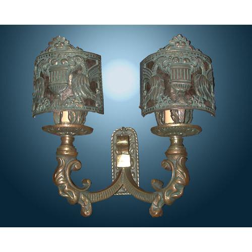 Distinctive styling attributed to Oscar Bach. Oscar Bruno Bach (German/American 1884-1957) designed and fabricated a number of exquisite metal lighting devices during the 1920s and 1930s. Working out of his New York Studio, Bach was familiar with Tiffany Studios and the similarly high end workshops which produced fine bronze lamp bases with leaded shades. /oscarbach.html <BR><BR> Electrification updated. Price is for the pair.