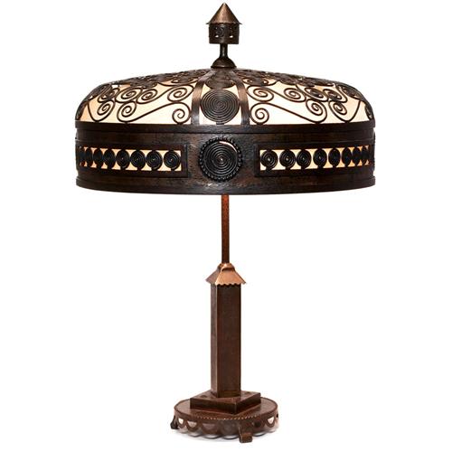 Oscar Bach lamp, attribution, hammered iron base supporting a shade with elaborate reticulated spiral designs and white silk liner, original patina, 19"dia. x 29"