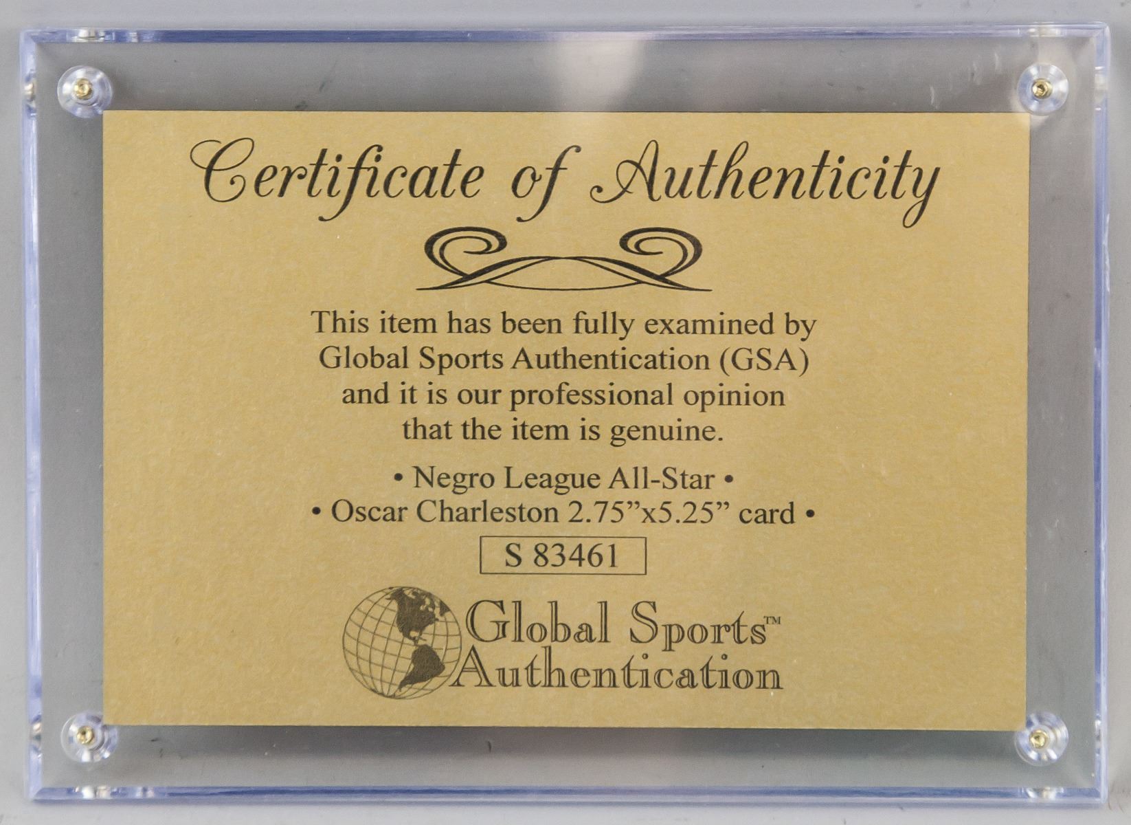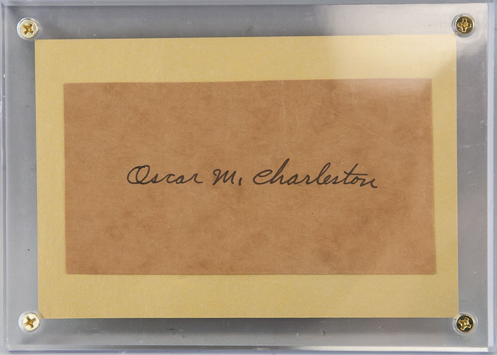 Autographed cut card, signed Oscar Charleston. Accompanied with a certificate of authenticity. 12.5 x 17.5 cm. Photograph not included in the lot. Oscar McKinley Charleston (1896-1954 was an American center fielder and manager in Negro league baseball. In 1915, after serving three years in the U.S. Army, the Indianapolis, Indiana, native continued his baseball career as a professional with the Indianapolis ABCs; his career ended in 1954 as a player-manager for the Indianapolis Clowns. In addition to a forty-three-year career with more than a dozen teams, including the Homestead Grays and the Pittsburgh Crawfords, Negro league baseball's leading teams in the 1930s, he played nine winter seasons in Cuba and in numerous exhibition games against white major leaguers. Charleston was known for his strengths as a hitter and center fielder. He was inducted into the National Baseball Hall of Fame in 1976.