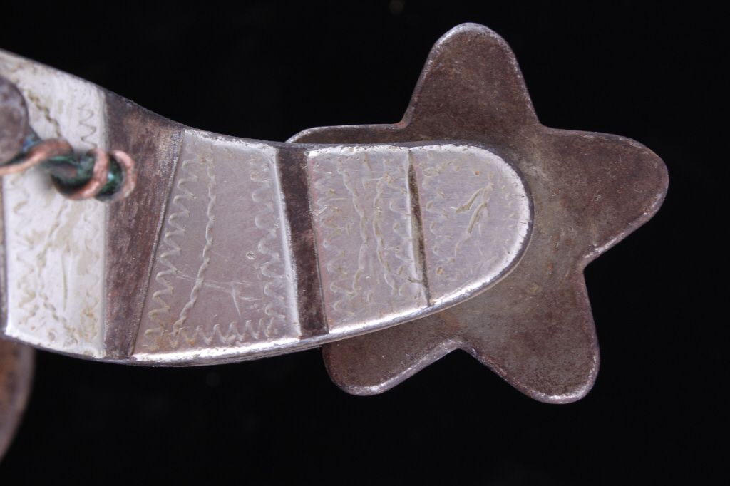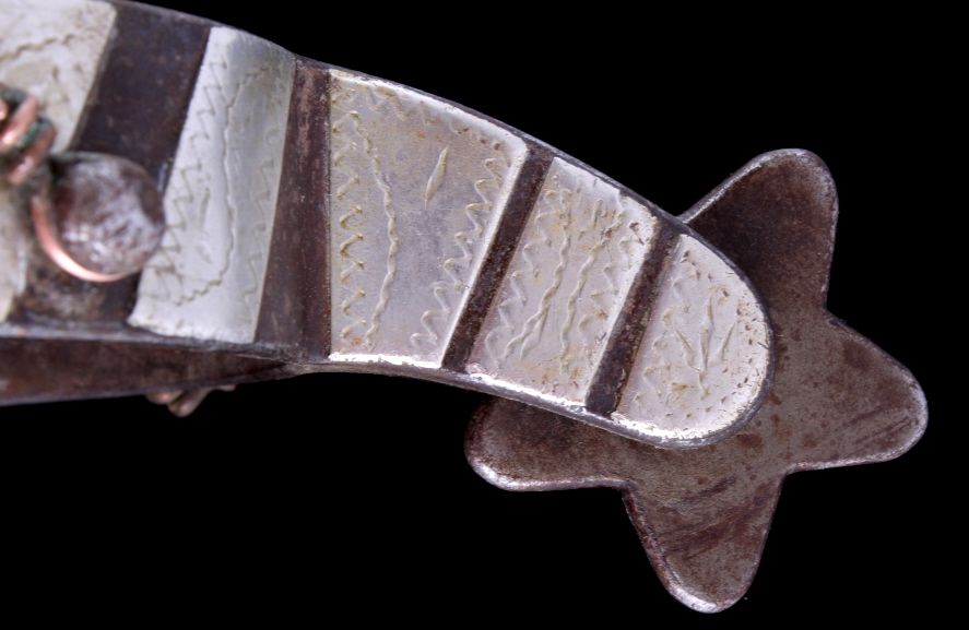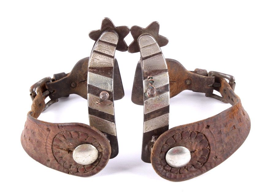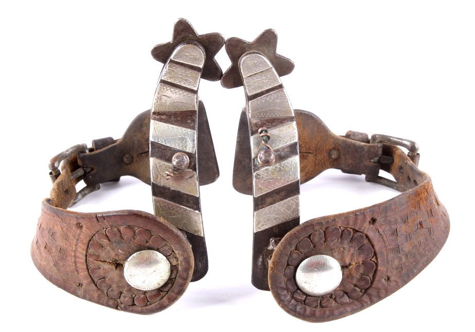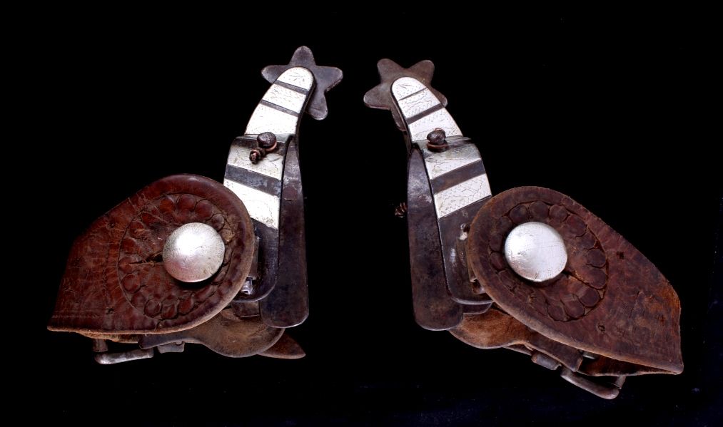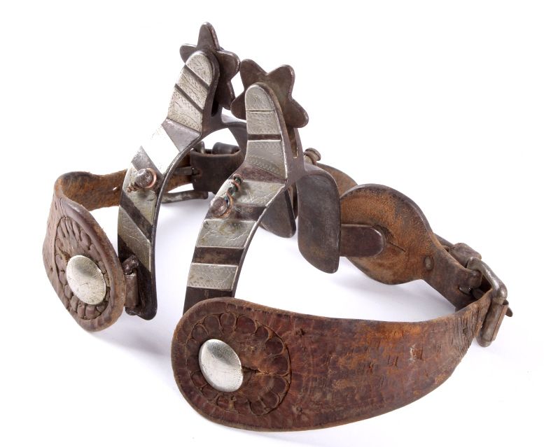 The lot features a set of early Oscar Crockett spurs. These are single mounted believed to be No. 201 Homer Ward spurs. The set shows silver mounted design and are marked Crockett on the outside. Each spurs has a silver mounted stud. This come with early leather tooled spur straps. The pieces are early 1900’s highly collectible spurs. Spurs 5 point 1 ½” star rowels and overall 5 ¼”x4 ¼”