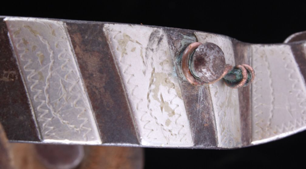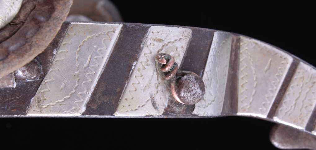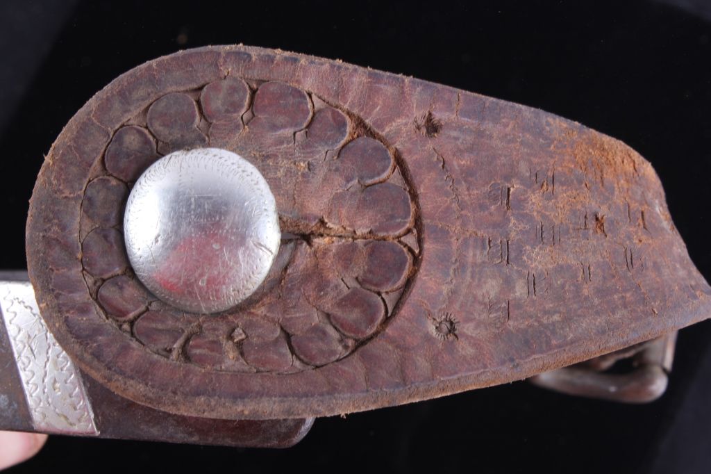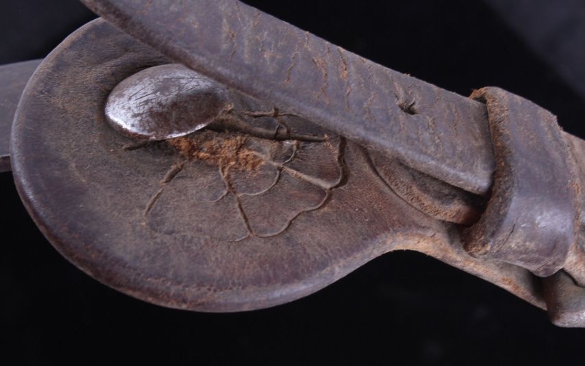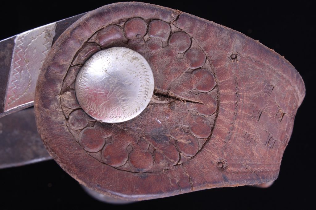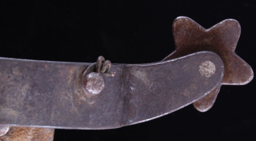 The lot features a set of early Oscar Crockett spurs. These are single mounted believed to be No. 201 Homer Ward spurs. The set shows silver mounted design and are marked Crockett on the outside. Each spurs has a silver mounted stud. This come with early leather tooled spur straps. The pieces are early 1900’s highly collectible spurs. Spurs 5 point 1 ½” star rowels and overall 5 ¼”x4 ¼”