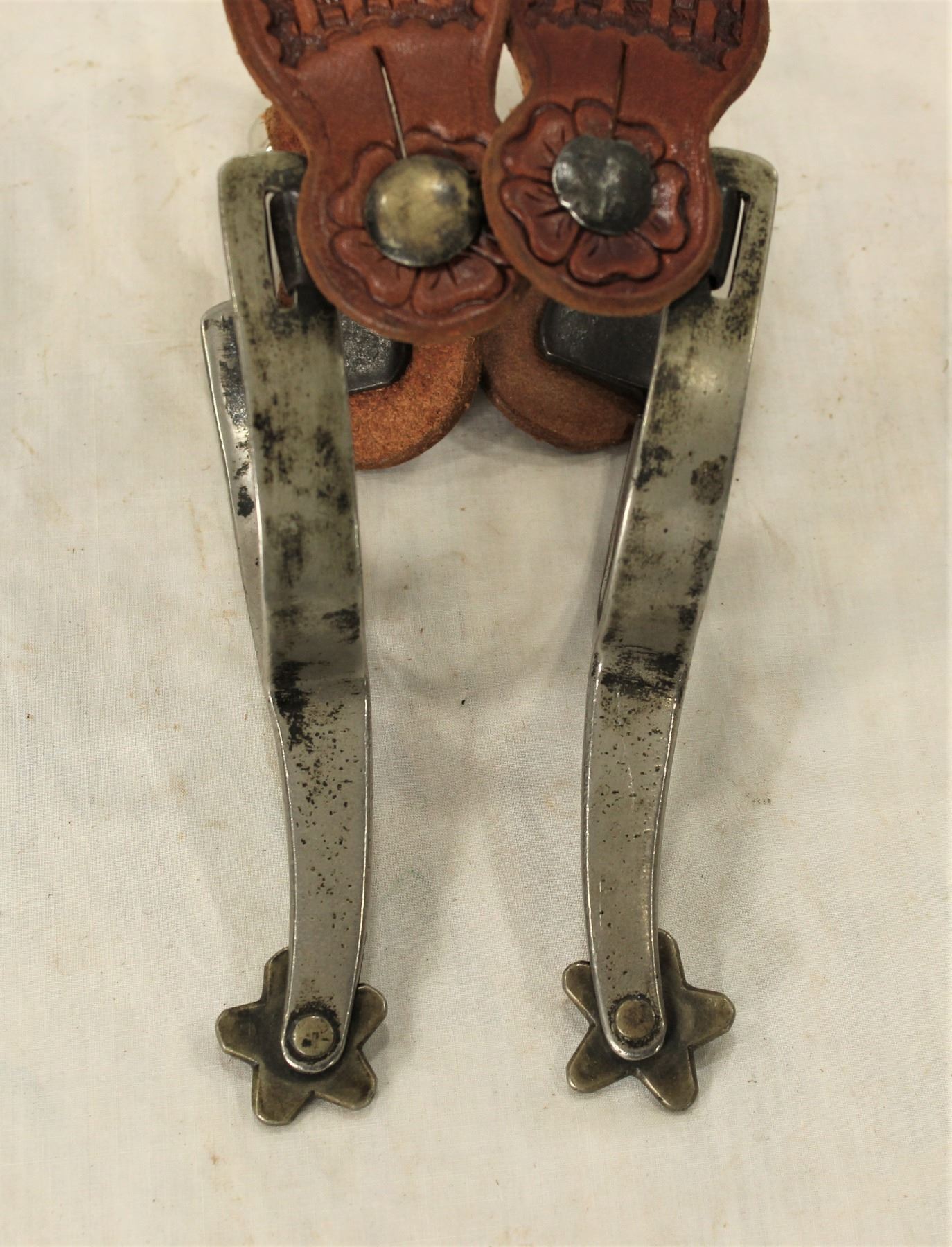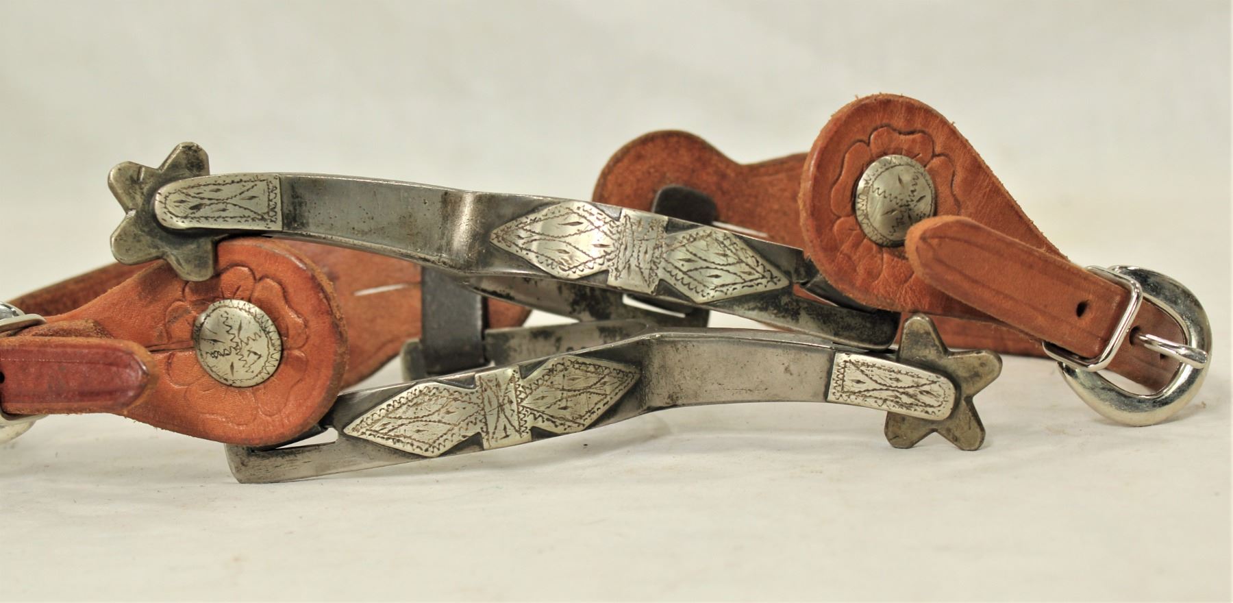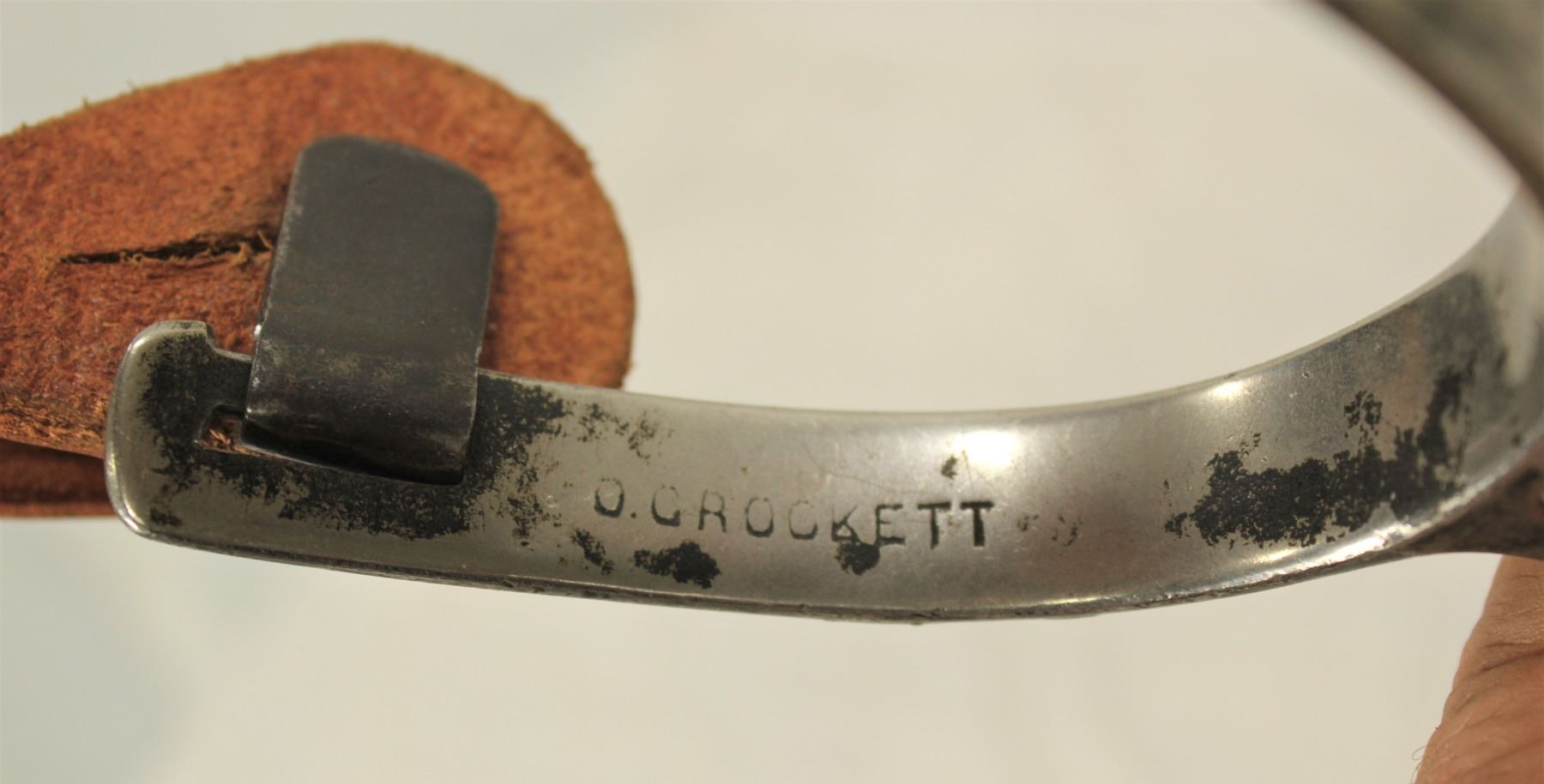 Very rare O. Crockett single mounted spurs in the Ft. Stockton pattern. Showing decorative engraved bowties and 5-point star rowels.