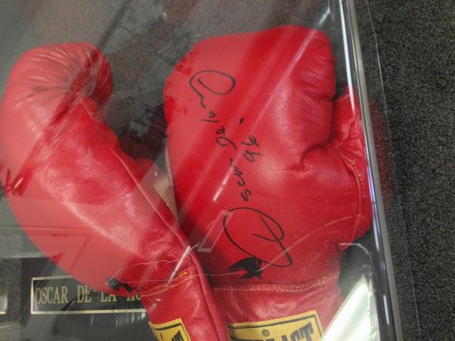 Amazing display case with one of the most famous boxers of all time "Oscar De La Hoya" autographed red boxing gloves and picture of the boxer, autographed is "Oscar De La Hoya 96".(18x9)