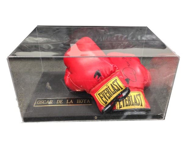 Amazing display case with one of the most famous boxers of all time "Oscar De La Hoya" autographed red boxing gloves and picture of the boxer, autographed is "Oscar De La Hoya 96".(18x9)