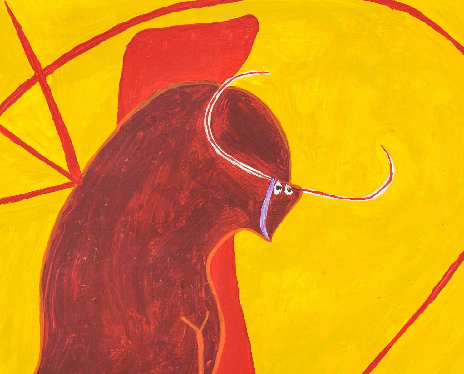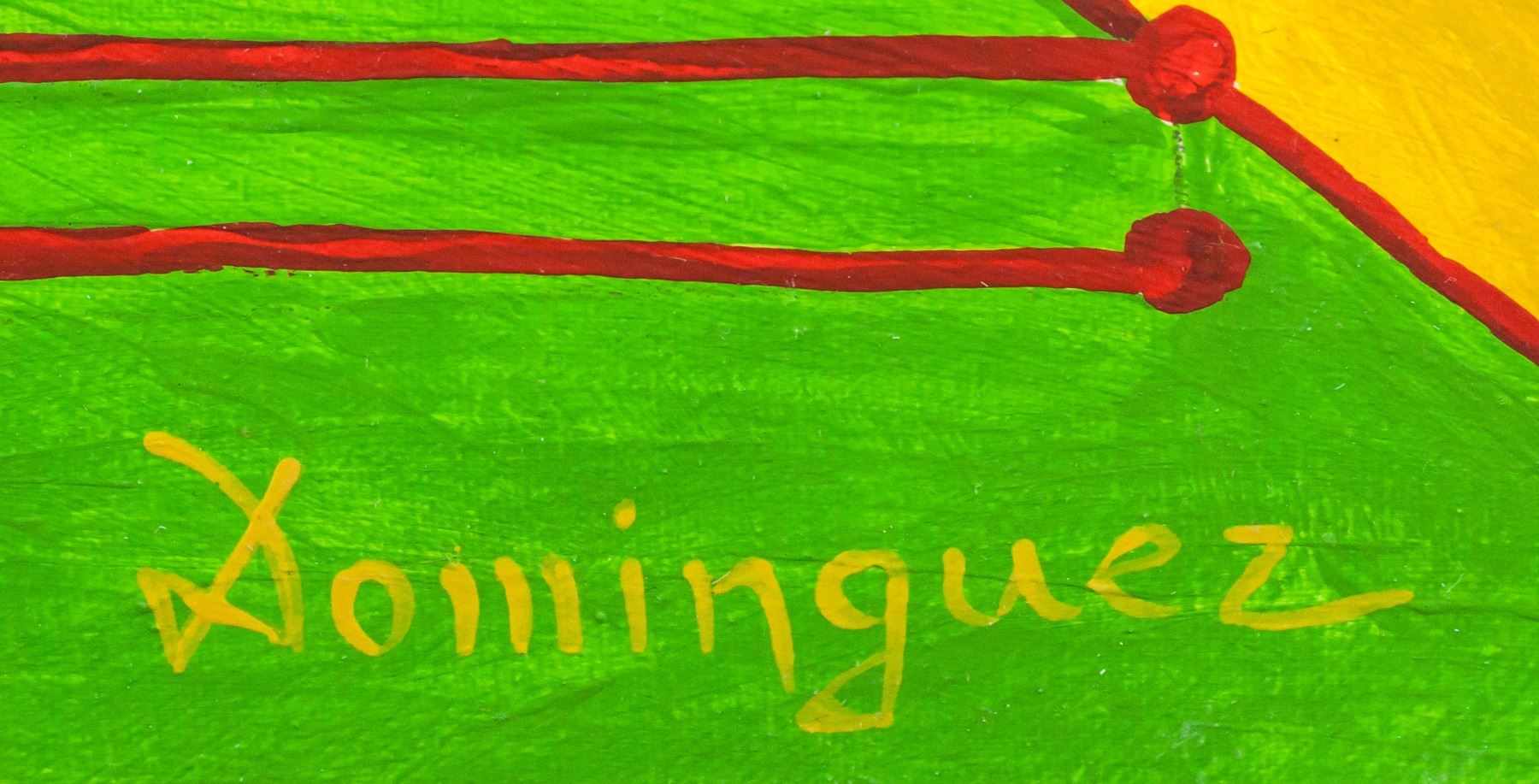 Oil on canvas. Featuring a bull in front of a red cape standing on thing stick structures. Signed "Dominguez" in the bottom right. Attributed to Oscar Dominguez (1906-1957, Spanish). 48 x 43 cm (18.75 x 17 in). Provenance: This lot carries limited provenance from a Southern Ontario estate