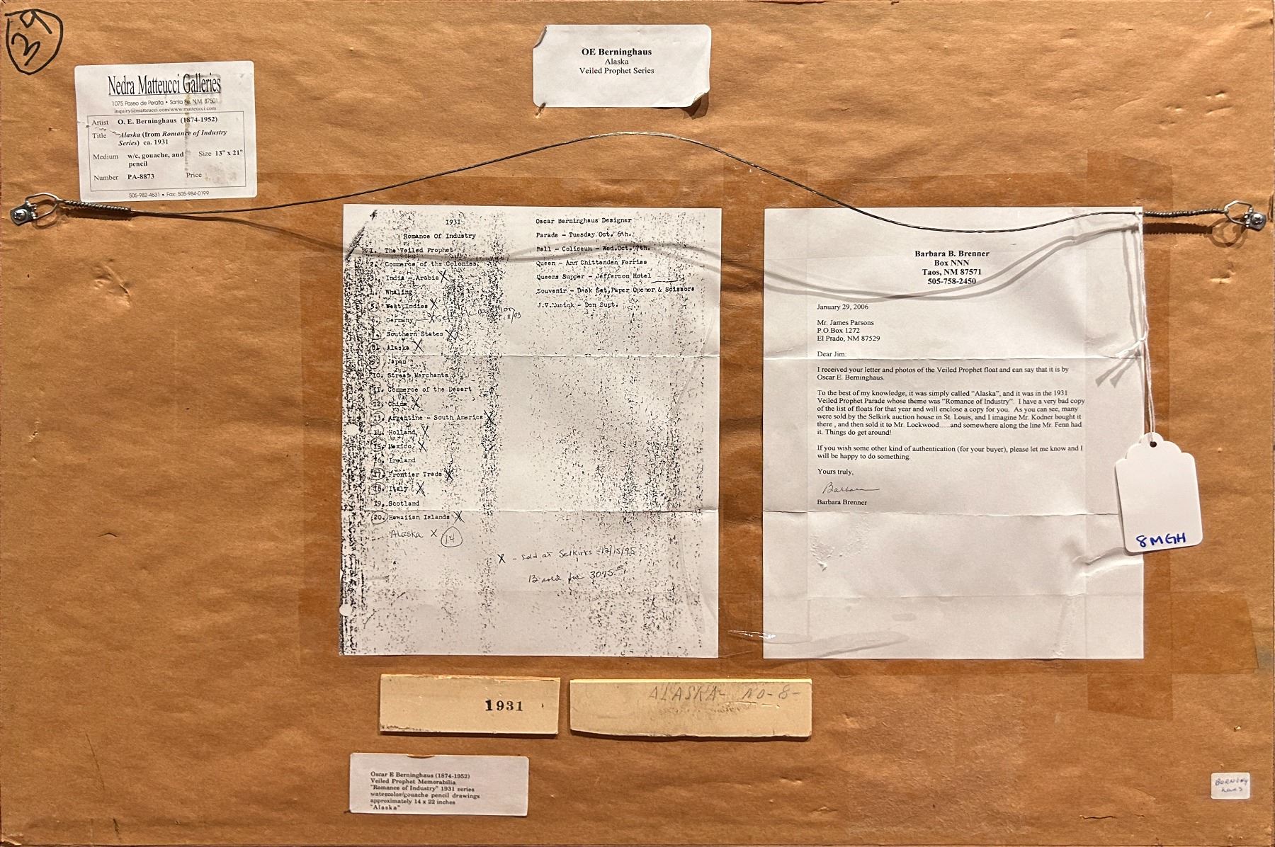 Oscar E. Berninghaus was born St. Louis MO in 1874. He was a painter, muralist, and lithographer, specializing in western subjects. For many years, he spent summers in Taos and winter months in St Louis where he designed the costumes and floats for the Veiled Prophet Parade, a famous annual event in St. Louis. "Alaska" was a float desing in the 1931 parade. He visited Taos regularly and settled there in 1925 where he was a founder in 1898 of the Taos Society of Artists.