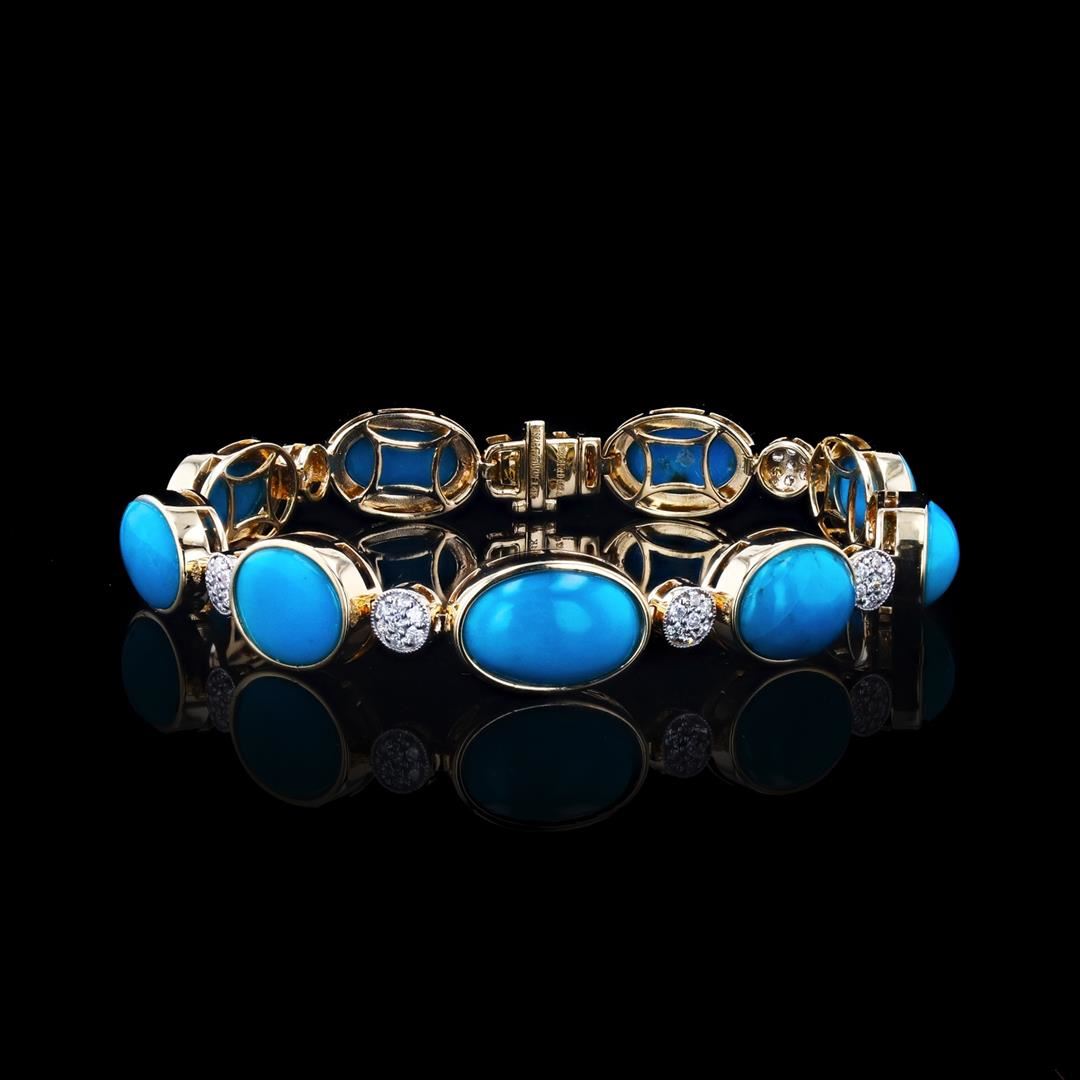 Oscar Friedman 14K Yellow Gold Turquoise and Diamond Bracelet. Please see Photos and Description for all available information. Oscar Friedman's 14K Yellow Gold Turquoise and Diamond Bracelet is an elegant and dazzling piece for men and women alike. This handmade 14K Yellow Gold Bracelet is made of 9 Oval Cabochon Cut Natural Turquoise gems weighing 28.61ctw and 7-inch 14K Yellow Gold Bracelet,63 Diamonds weighing 0.82ctw. The Turquoise gemstones are cut into round, oval, and marquise shapes and display vivid, earth