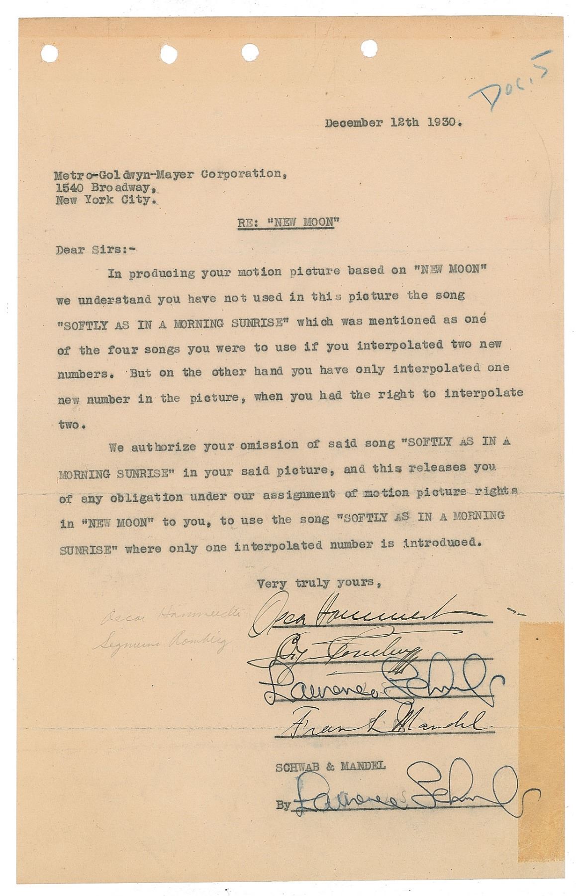 DS, signed “Oscar Hammerstein" and "Sig Romberg,” one page, 7.5 x 12, December 12, 1930. Official letter directed to Metro-Goldwyn-Mayer with subject marked "RE: 'New Moon,' and reading, in full: "In producing your motion picture based on 'New Moon' we understand you have not used in this picture the song 'Softly As in a Morning Sunrise' which was mentioned as one of the four songs you were to use if you interpolated two new numbers. But on the other hand you have only interpolated one new number in the picture, when you had the right to interpolate two. We authorize your omission of said song 'Softly As in a Morning Sunrise' in your said picture, and this releases you of any obligation under our assignment of motion picture rights in 'New Moon' to you, to use the song 'Softly As in a Morning Sunrise' where only one interpolated number is introduced." Signed at the conclusion by Hammerstein and Romberg, and by producers Laurence Schwab and Frank Mandel, with Schwab signing twice. In very good to fine condition, with file holes to the top edge and old tape residue to the lower right edge. An interesting document authorizing the song 'Softly As in a Morning Sunrise' to be omitted from the movie version of their operetta New Moon. New Moon was given its first stage performance in 1927, the year of the first 'talking' movie, and was one of the first musicals to be adapted for the new media.