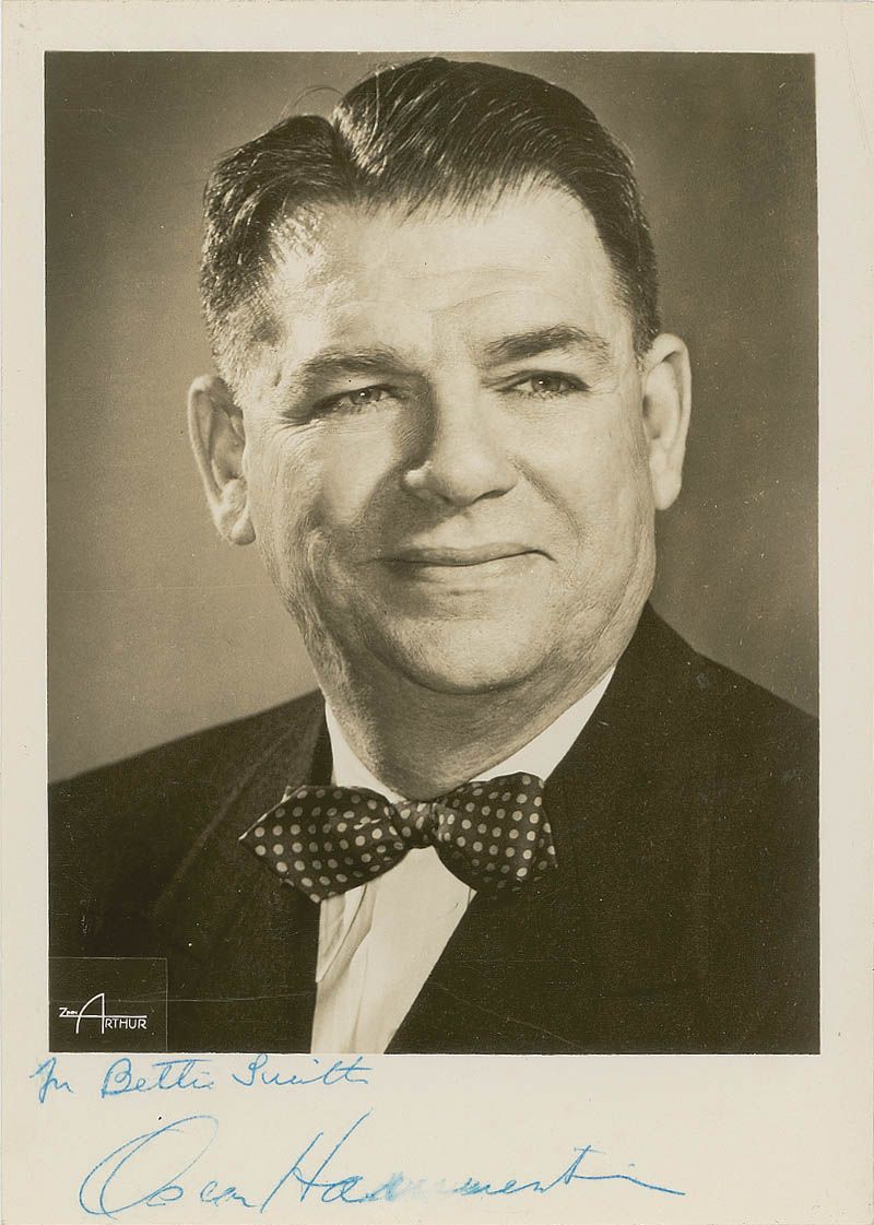 Vintage glossy 5 x 7 head-and-shoulders photo, signed and inscribed in the lower border in blue ballpoint “To Bettie Smith, Oscar Hammerstein.” In fine condition, with some light skipping and irregular adhesion to signature and a few scattered surface marks to image.