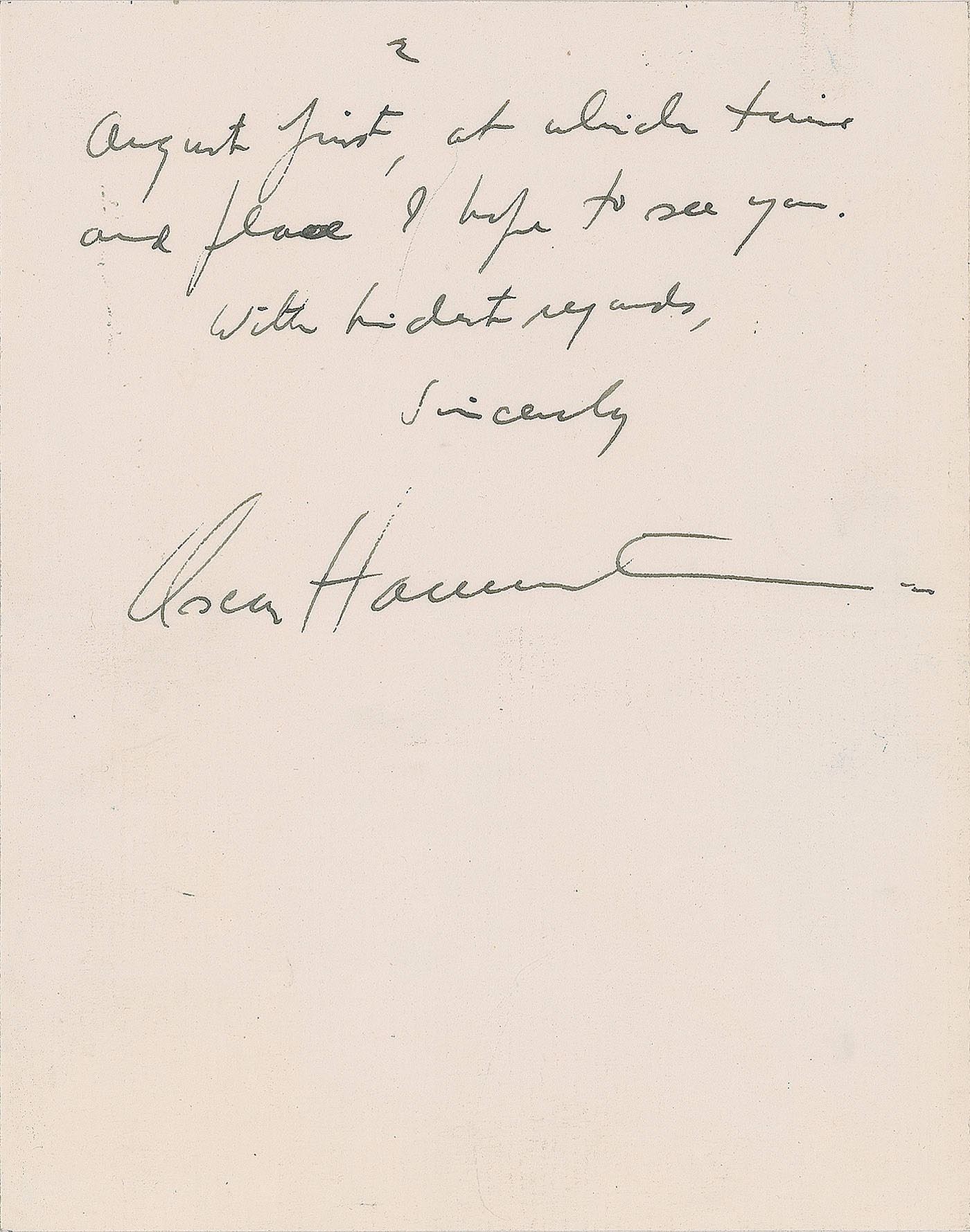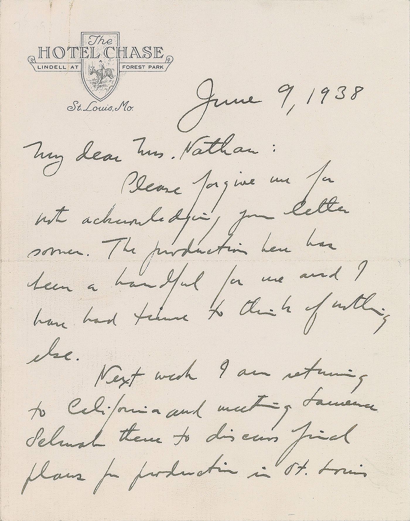 ALS, two pages on two adjoining sheets, 5.5 x 7, The Hotel Chase in St. Louis, Missouri letterhead, June 9, 1938. Letter to Mrs. Nathan, in full: "Please forgive me for not acknowledging your letter sooner. The production here has been a handful for me and I have had time to think of nothing else. Next week I am returning to California and meeting Lawrence Schwab there to discuss final plans for production in St. Louis August first, at which time and place I hope to see you." In fine condition, with a light paperclip impression to the top edge.
