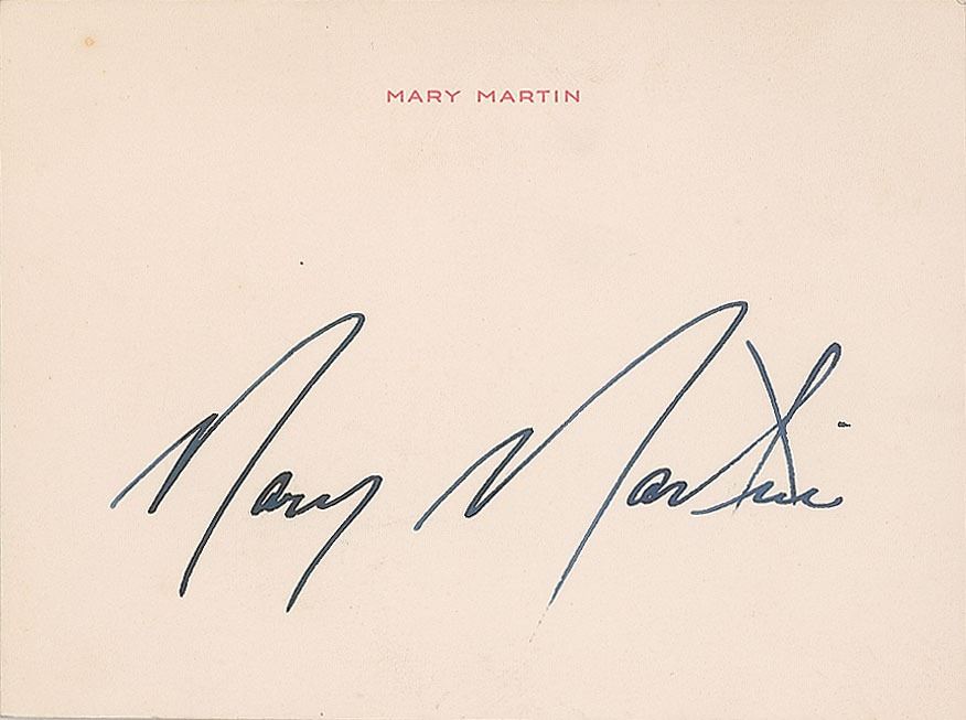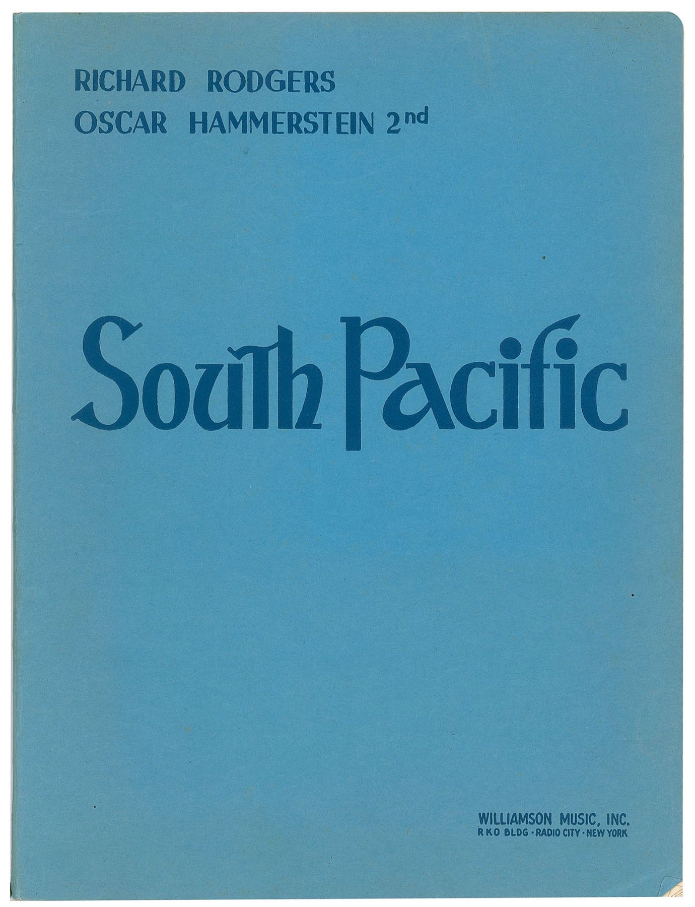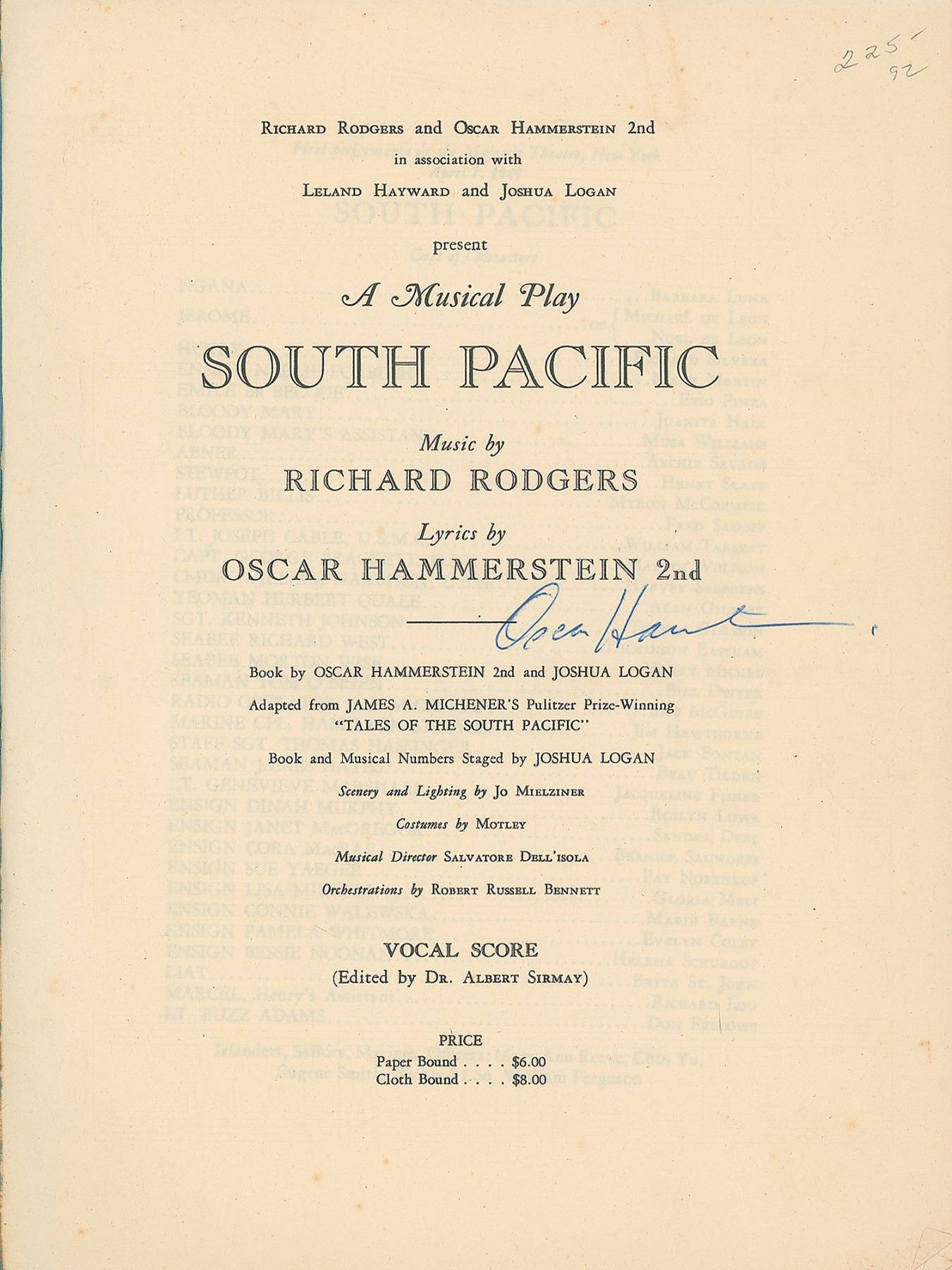 Vintage sheet music booklet for the Rodgers and Hammerstein musical South Pacific, published by Williamson Music, Inc., 172 pages, 9 x 12, signed on the title page in blue ballpoint by Oscar Hammerstein. Includes a felt tip signature of Mary Martin on an off-white 5.25 x 3.75 personal stationery card. In overall fine condition.