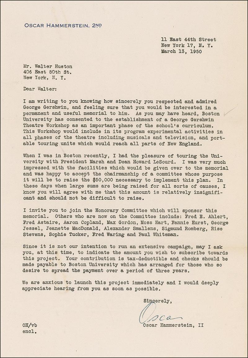 TLS, one page, 7.25 x 10.5, personal letterhead, March 13, 1950. Letter to Walter Huston. In part: “As you may have heard, Boston University has consented to the establishment of a George Gershwin Theatre Workshop…I…was happy to accept the chairmanship of a committee whose purpose it will be to raise the $50,000 necessary to implement this plan…I invite you to join the honorary committee which will sponsor this memorial. Others who are now on the Committee include: Fred E. Ahlert, Fred Astaire, Aaron Copland, Max Gordon, Moss Hart, Fannie Hurst, George Jessel, Jeanette MacDonald, Alexander Smallens, Sigmund Romberg, Rise Stevens, Sophie Tucker, Fred Waring, and Paul Whiteman.” In fine condition, with a uniform shade of mild toning, and a few light creases.
