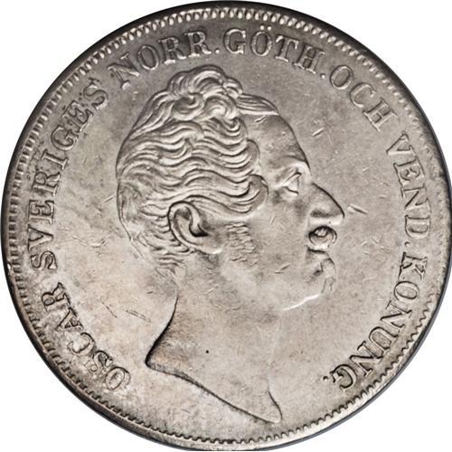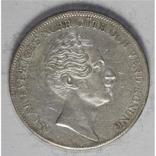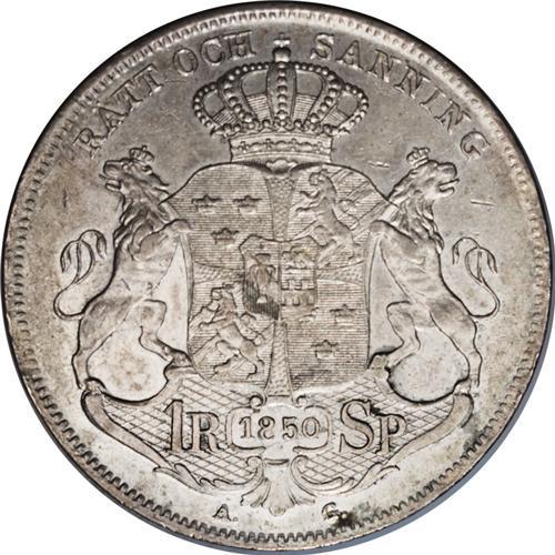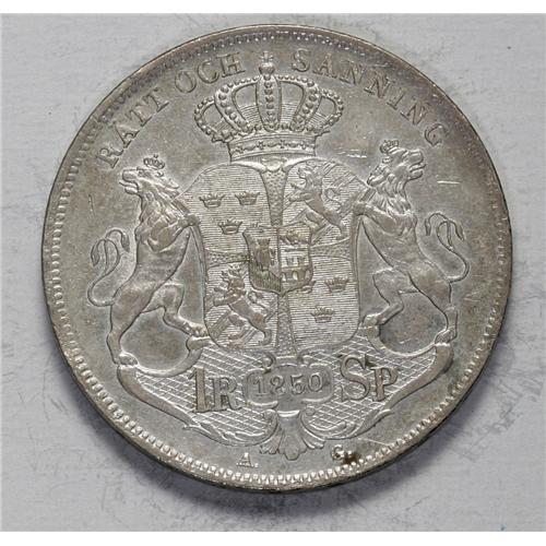 <B>Oscar I Riksdaler Specie 1850-AG, </B></I>KM667, bold XF, lightly cleaned but with some original luster in the reverse legends. Uncertain overdate, although the 5 is clearly punched over a 4.<BR><I>From the Monedas Oro Collection</B></I><BR><BR><b>Shipping:</b> Coin/Currency (<a target="_blank" href="http://www.heritageauctions.com/common/shipping.php">view shipping information</a>)