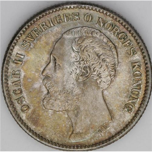 <B>Oscar II 2 Kronor 1876-EB, </B></I>KM742, MS64 NGC, deep and completely original gray-gold toning over fully lustrous surfaces, very rare and attractive grade for this denomination. Collectors in Sweden are often skeptical of coins in USA slabs, but this example might earn a "praktex" in Stockholm.