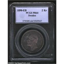 Oscar II 2 kronor 1890-EB, Bust left/Arms with date and value, KM-536, PR64 PCGS. Nice gray and russet toning. Very rare. Important notice: We expect to be auctioning lots at the rate of 200-250 per hour. Sometimes eBay Premier live bid software cannot keep up with that pace, so we strongly recommend that you place a realistic proxy bid now as insurance to avoid disappointment. Also please note that all Heritage/CAA lots purchased through eBay Premier carry a 20% Buyer's Premium. Please make sure you read the Terms and Conditions.