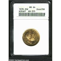 Oscar II Gold 20 Kroner 1878, KM355, MS64 ANACS. Important notice: We expect to be auctioning lots a