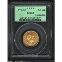 Oscar II Gold 20 Kronor 1873-ST, Head right with date below/Crowned and mantled arms with value, F-93, KM-733, MS63 PCGS. Important notice: We expect to be auctioning lots at the rate of 200-250 per hour. Sometimes eBay Premier live bid software cannot keep up with that pace, so we strongly recommend that you place a realistic proxy bid now as insurance to avoid disappointment. Also please note that all Heritage/CAA lots purchased through eBay Premier carry a 20% Buyer's Premium. Please make sure you read the Terms and Conditions.