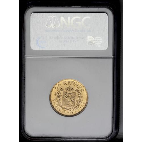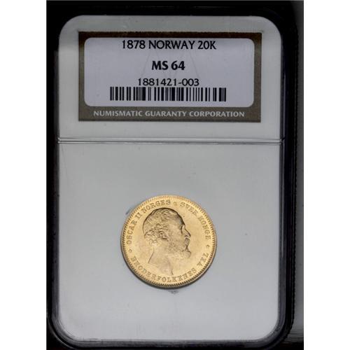 <B>Oscar II gold 20 Kroner 1878, </B></I>KM355, MS64 NGC, full blazing mint luster.