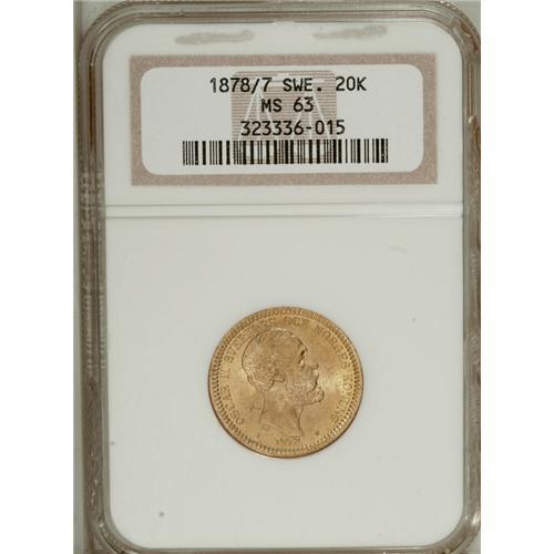 <B>Oscar II gold 20 Kronor 1878/7, </B></I>KM748, MS63 NGC, very bold overdate.
