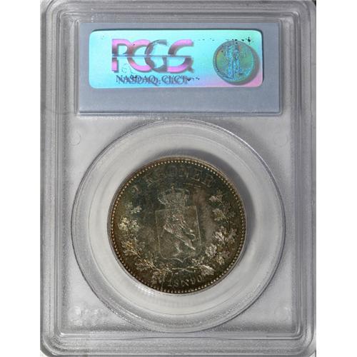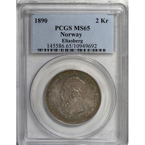 <B>Oscar II of Sweden 2 Kroner 1890, </B></I>KM359, MS65 PCGS Eliasberg, a fabulous example with iridescent patina and incredible eye appeal. There is one tiny spot in the right obverse field mentioned for absolute accuracy. A wondercoin!<BR><I>From the Louis E. Eliasberg, Sr. Collection</B></I><BR><BR><b>Shipping:</b> Coin/Currency (<a target="_blank" href="http://www.heritageauctions.com/common/shipping.php">view shipping information</a>)