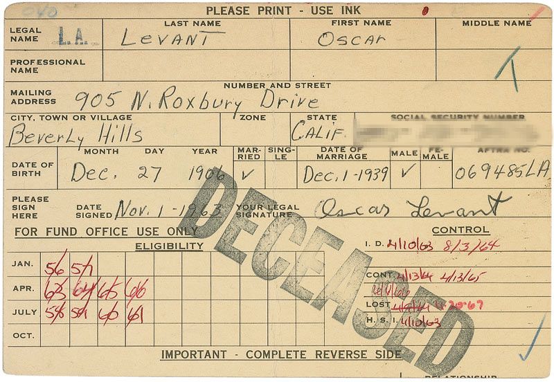 Pianist, radio personality and author, perhaps best remembered for his autobiography, Memoirs of an Amnesiac. Levant’s rare yellow AFTRA union P&W benefits card, one page, both sides, 6 x 4, dated November 1, 1963. Pension and Welfare benefit card is filled out (possibly by Levant), with his Beverly Hills address, birthdate, and Social Security number. Signed at the bottom in black ballpoint “Oscar Levant.” On the reverse, his wife is listed as the recipient of his death benefits. Stamped across the front of the card is “Deceased.” Moderate vertical crease down middle of document, several office notations, and a staple hole to top left, otherwise fine condition—the signature area remains clean.
