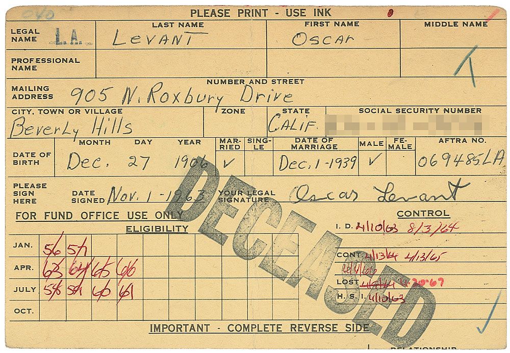DS, one page both sides, 6 x 4, November 1, 1963. Personal information card naming Levant’s beneficiaries in the case of his death, filled out by Levant on the front with his address, social security number, date of birth, date of marriage, and AFTRA membership number, with his wife and daughter named as beneficiaries on the reverse. A central vertical fold, large ‘deceased’ stamp, and other various office stamps and notations, otherwise fine condition.