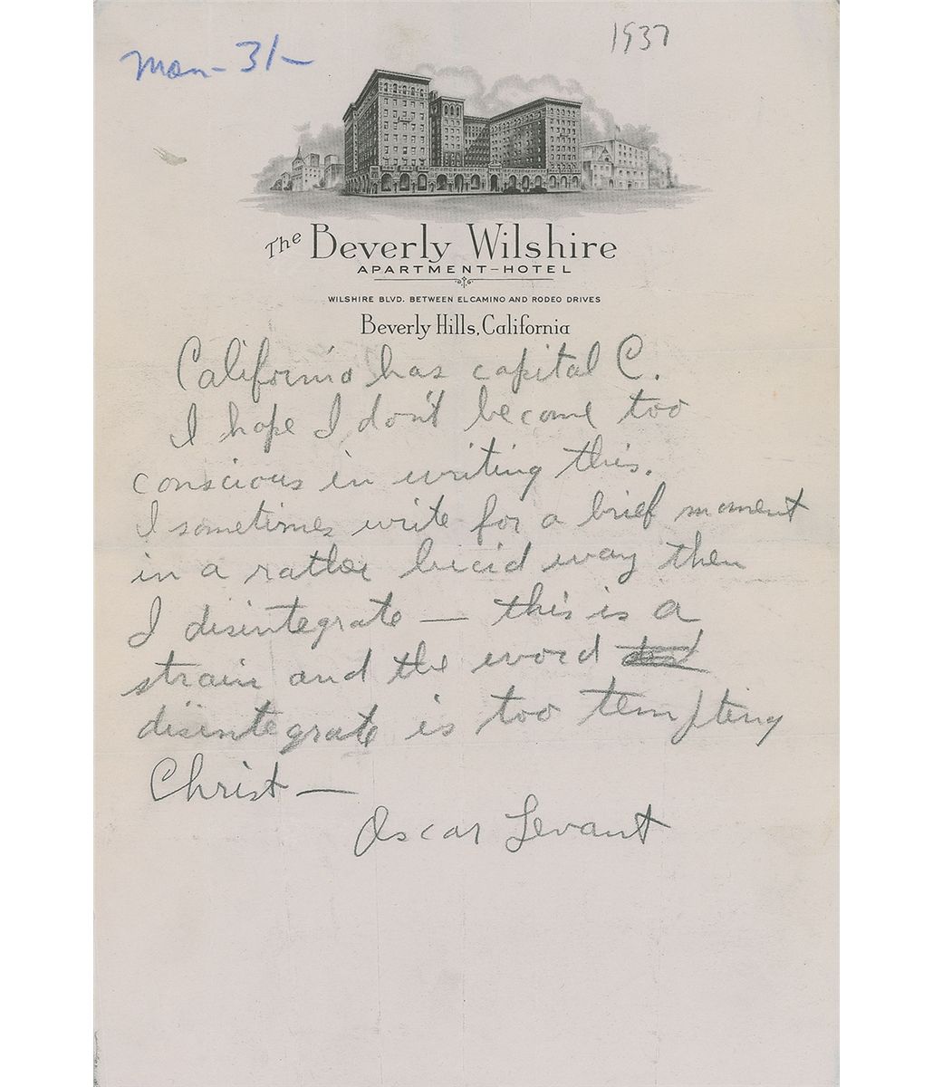 Pianist, radio personality, and author (1906–1972) perhaps best remembered for his autobiography, Memoirs of an Amnesiac. Unusual AMS in pencil, one page, 7.25 x 10.5, date notation of 1937. Levant pens a brief yet intriguing passage. In full: “California has a capital C. I hope I don’t become too conscious in writing this. I sometimes write for a brief moment in a rather lucid way then I disintegrate—this is a strain and the word disintegrate is too tempting. Christ.” In very good condition, with several intersecting folds (many passing through letters of the signature) and scattered creases.
