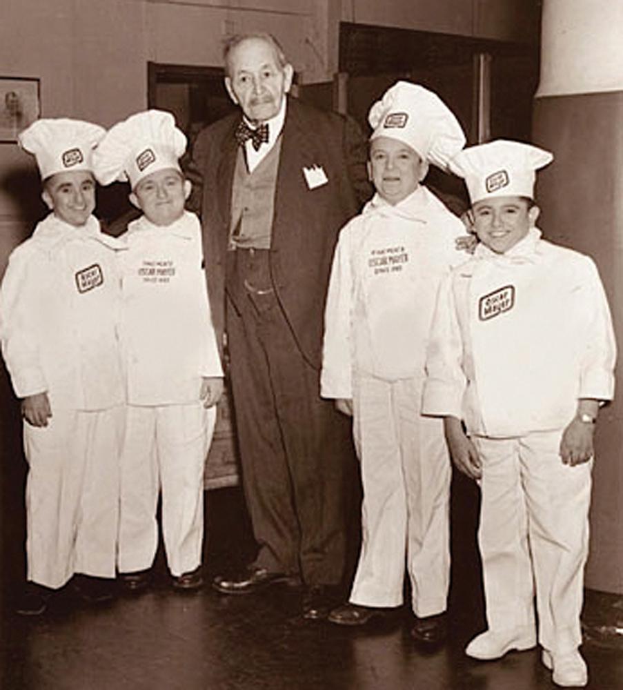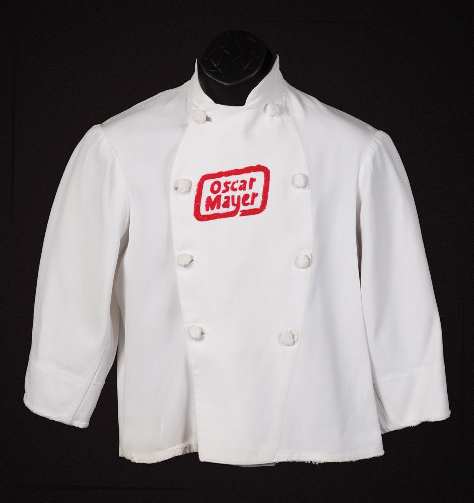 Little Oscar white cotton chef jacket sized for a small person with white buttons along the front closure and an applied rectangular “Oscar Meyer” logo patch at the center chest worn circa 1950s and beyond by actor Jerry Maren, who was advertised as being, “the world’s smallest chef.” During the same era, Maren as Little Oscar made numerous personal appearances with the 27-foot-long Oscar Meyer Wienermobile. Mr. Oscar Meyer personally created the character of the small chef in the 1930s, and equally noteworthy is the fact that Mr. Maren had previously played the role of a Lollipop Guild munchkin in the film, The Wizard of Oz (MGM, 1939). Acquired from Mr. Jerry Maren.