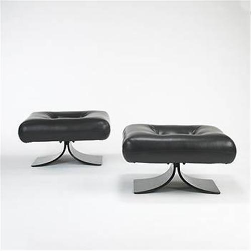Oscar Niemeyer stools, pair Tendo Brazil ebonized wood, leather, plastic 28"w x 28"d x 16"h