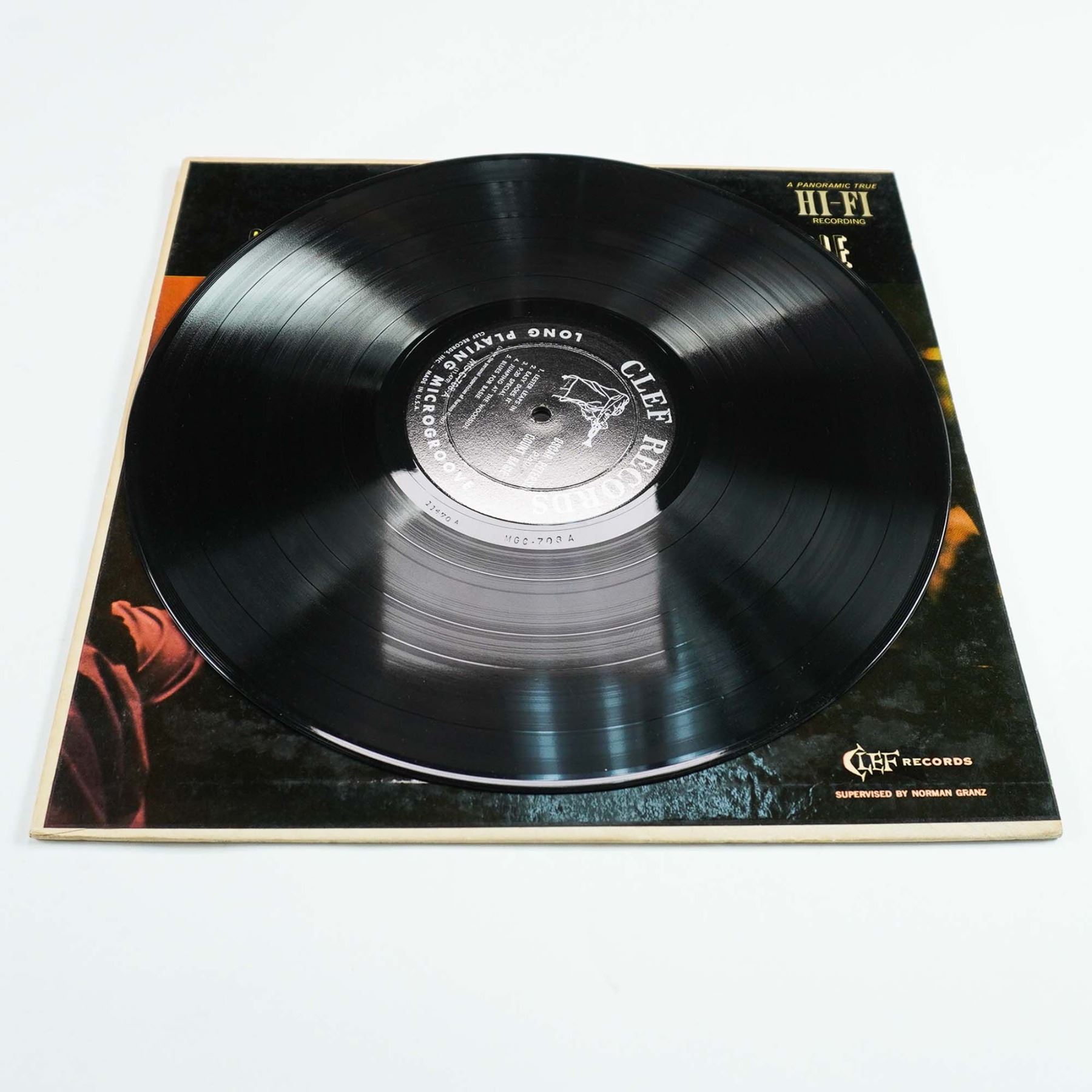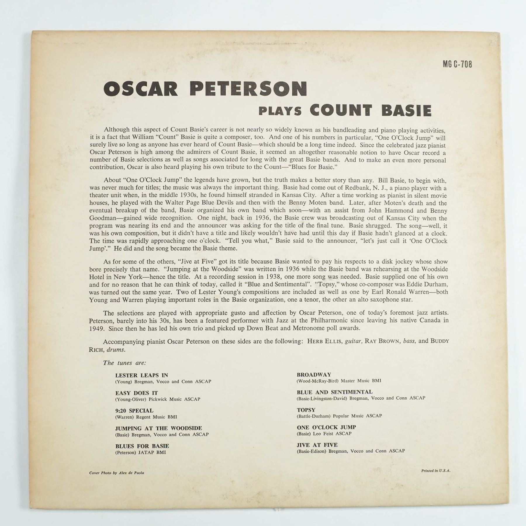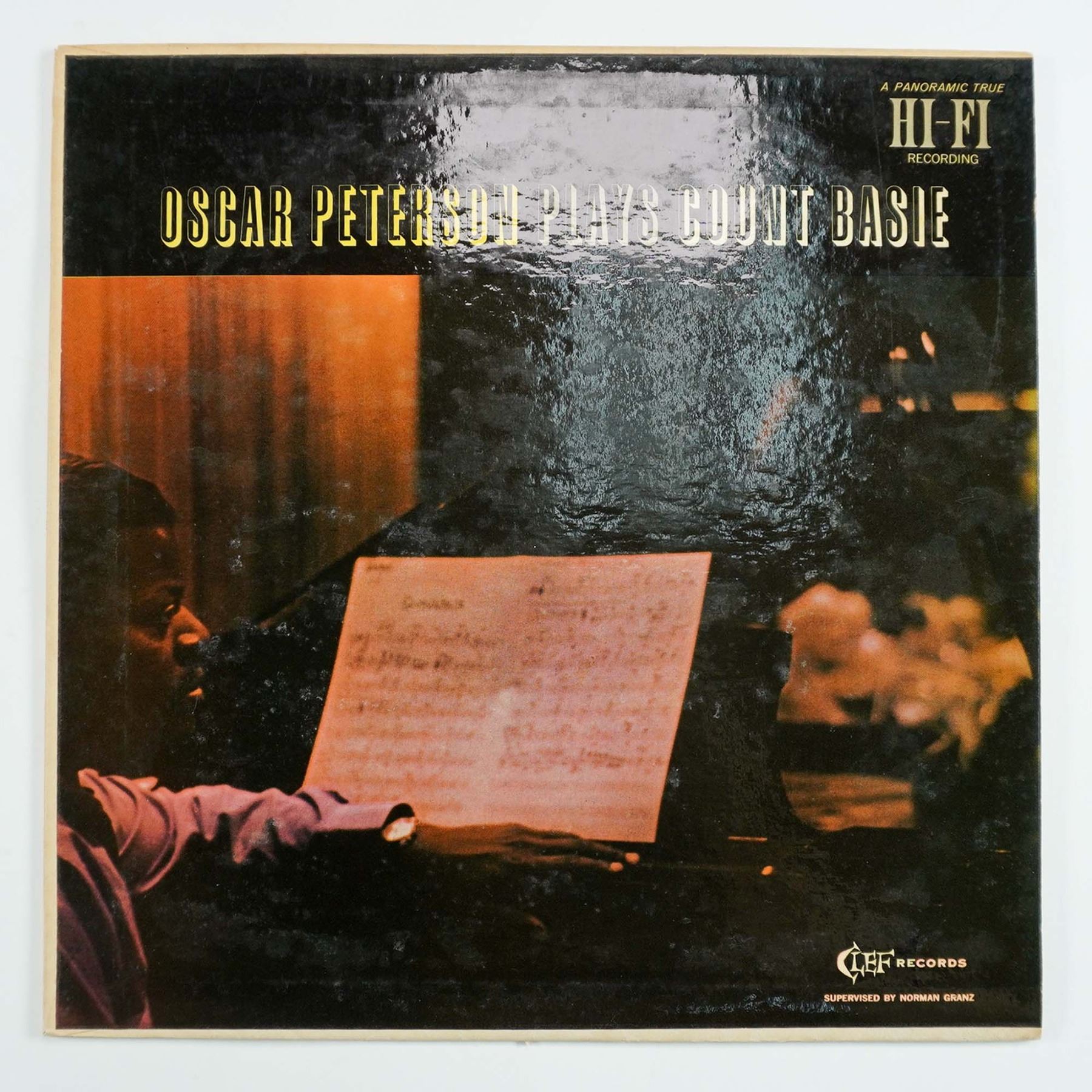 A vintage jazz album featuring the legendary Oscar Peterson performing interpretations of Count Basie's music. Released on Clef Records, catalog number MG C-708, this LP includes tracks such as "Lester Leaps In," "Jumpin' at the Woodside," and "Jive at Five," showcasing Peterson's virtuosic piano skills alongside accompaniment from notable jazz musicians Herb Ellis (guitar), Ray Brown (bass), and Buddy Rich (drums). The back cover provides detailed liner notes about Count Basie's influence and the session's recording history. The album cover exhibits some age-related wear, but the vinyl appears to be in good condition.