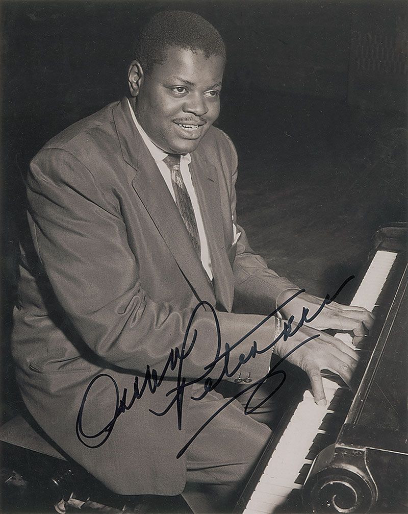 Glossy 8 x 10 photo of Peterson playing the piano, signed in black felt tip. In fine condition.