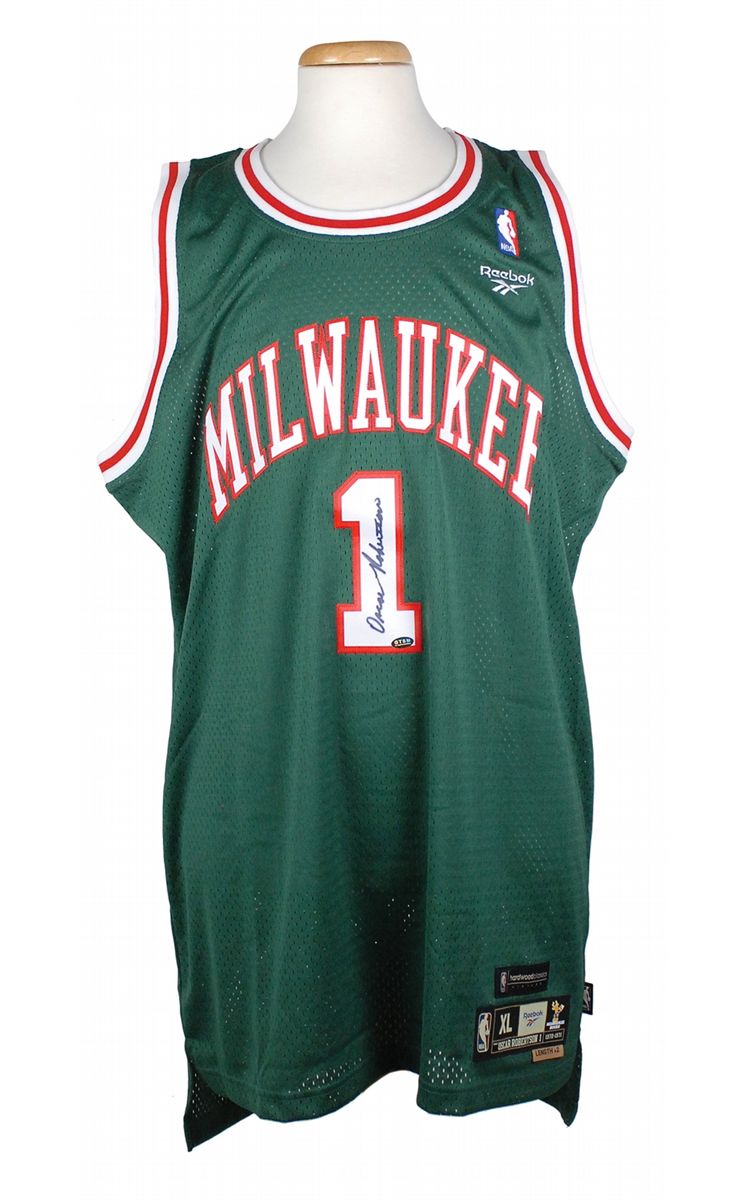 Official Reebok Hardwood Classics replica Milwaukee Bucks basketball jersey, with sewn on letters and numbers, signed in black felt tip on the number on the front. In fine condition.