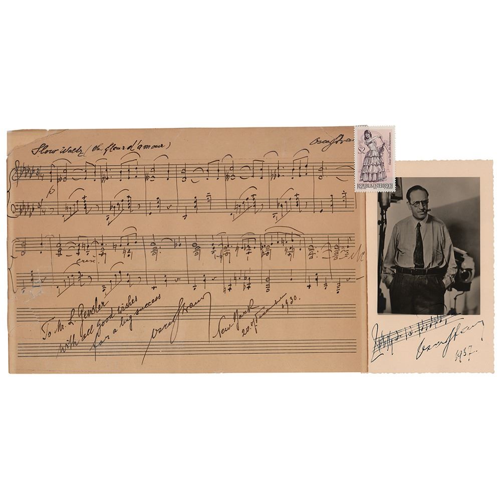 Two items: an AMQS on an off-white 9 x 6 musically lined sheet, featuring 16 bars on double staves from "La Fleur d'Amour," signed and inscribed in the lower border, "To Mr. L. Gensler, With all good wishes for a big success, Oscar Straus, New-York, 20 of December 1930," and signed in the upper right, "Oscar Straus"; and a 3.25 x 5.25 postcard photo of Strauss, featuring a three-bar autograph musical quotation from 'My Hero' from the operetta 'Chocolate Soldier,' signed by the composer, "Oscar Straus, 1937." In very good to fine condition, with several old repairs to tears and paper loss on the musical quotation.