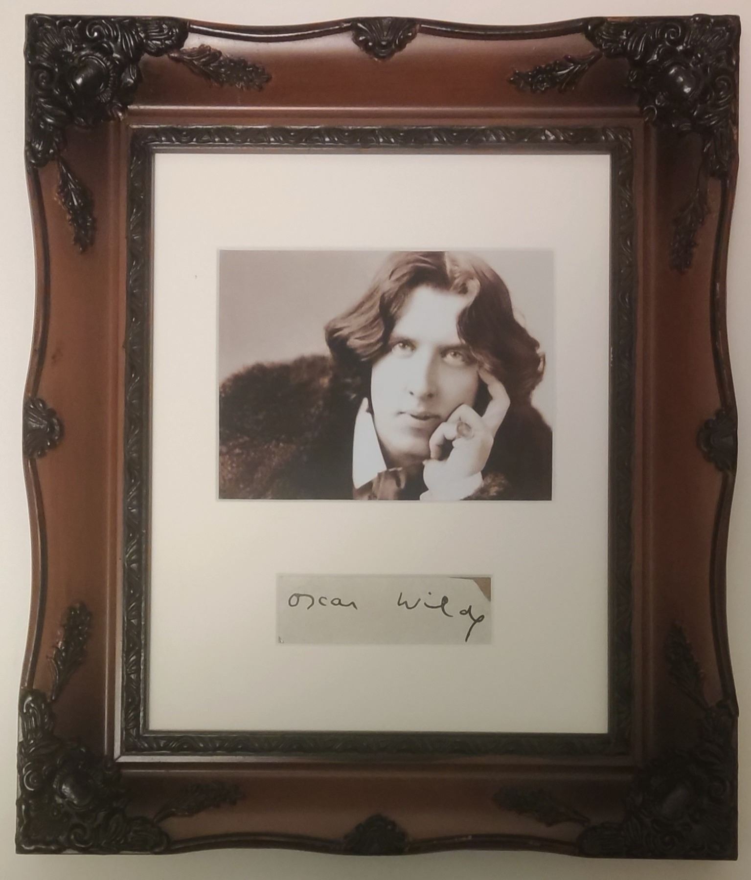 An Oscar Wilde signature measuring 3.5x1 inch. The signature has some paper loss on the edge. It's mounted and framed in an antique style frame (May be supplied in another equivalent frame). Supplied with its certificate of authenticity.