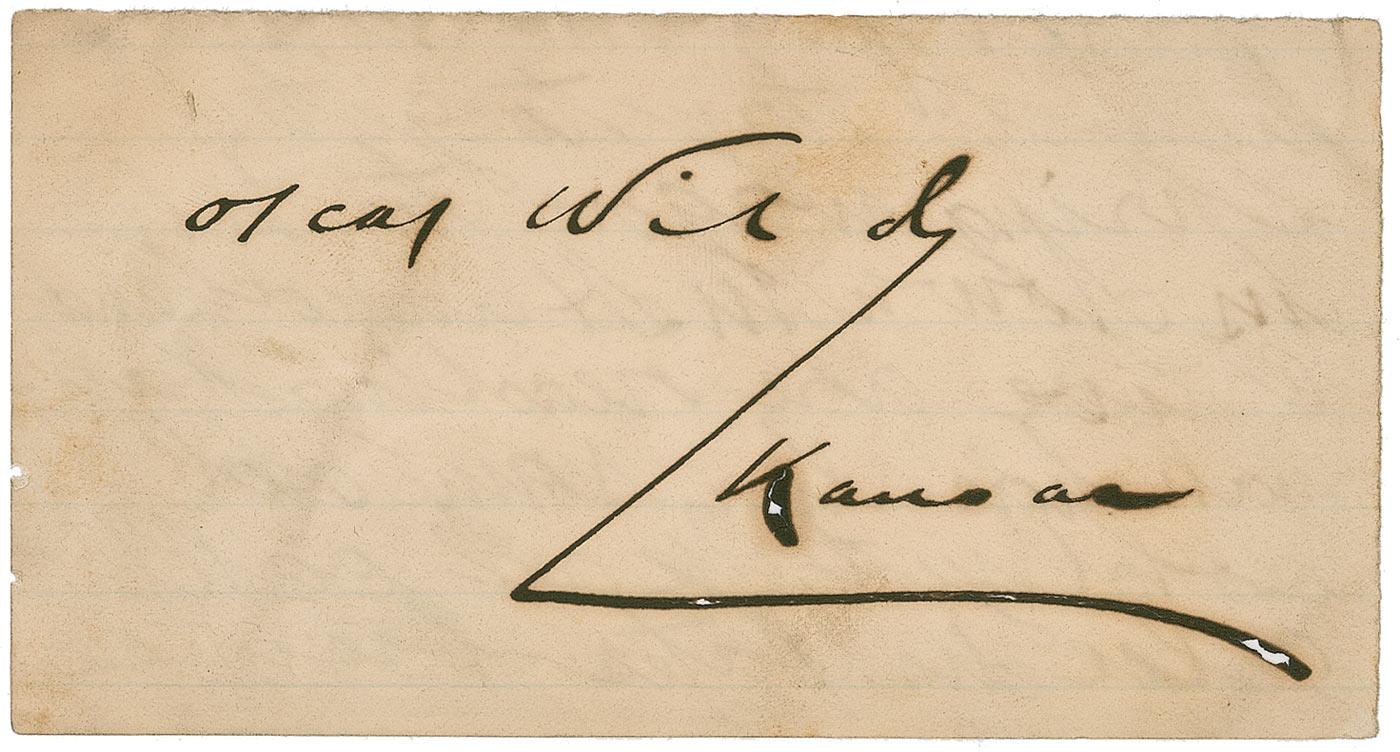 Irish writer and leader of the Aesthetic Movement, and author of such works as The Picture of Dorian Gray, The Importance of Being Earnest, and The Happy Prince. Ink signature, “Oscar Wilde, Kansas,” on an off-white 5 x 2.5 faintly-lined slip. In very good condition, with scattered toning and soiling, light show-through from writing on reverse, and fragile ink erosion to the paraph and the word “Kansas.”